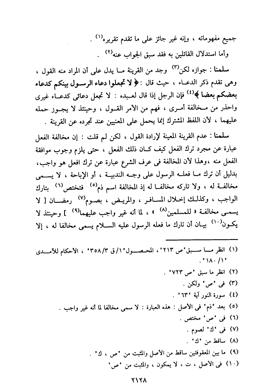 سلمنا: جوازه لكن وجد من القرينة ما يدل على أن المراد منه القول، وهي تقدم ذكر الدعاء، حيث قال: {لا تجعلوا دعاء الرسول بينكم كدعاء بعضكم بعضًا} فإن الرجل إذا قال لعبده: لا تجعل دعائي كدعاء غيري واحذر من مخالفة أمري، فهم من الأمر القول، وحينئذ لا يجوز حمله عليهما، لأن اللفظ المشترك إنما يحمل على المعنيين عند تجرده عن القرينة.
