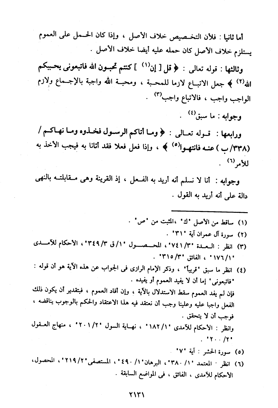وثالثها: قوله تعالى: {قل [إن] كنتم تحبون الله فاتبعوني يحببكم الله} جعلت الإتباع لازمًا للمحبة، ومحبة الله واجبة بالإجماع ولازم الواجب واجب، فالإتباع واجب.