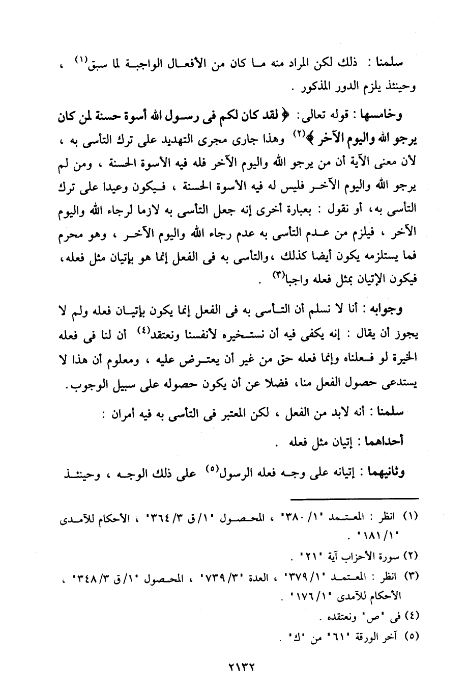 وخامسها: قوله تعالى: {لقد كان لكم في رسول الله أسوة حسنة لمن كان يرجو الله واليوم الآخر} وهذا جاري مجرى التهديد على ترك التأسي به، لأن معنى الآية أن من يرجو الله واليوم الآخر فله فيه الأسوة الحسنة، ومن لم يرجو الله واليوم الآخر فليس له فيه الأسوة الحسنة، فيكون وعيدًا على ترك التأسي به، أو نقول: بعبارة أخرى إنه جعل التأسي به لازمًا لرجاء الله واليوم الآخر، فيلزم من عدم التأسي به عدم رجاء الله واليوم الآخر، وهو محرم فما يستلزمه يكون أيضًا كذلك، والتأسي به في الفعل إنما هو بإتيان مثل فعله، فيكون الإتيان بمثل فعله واجبًا.