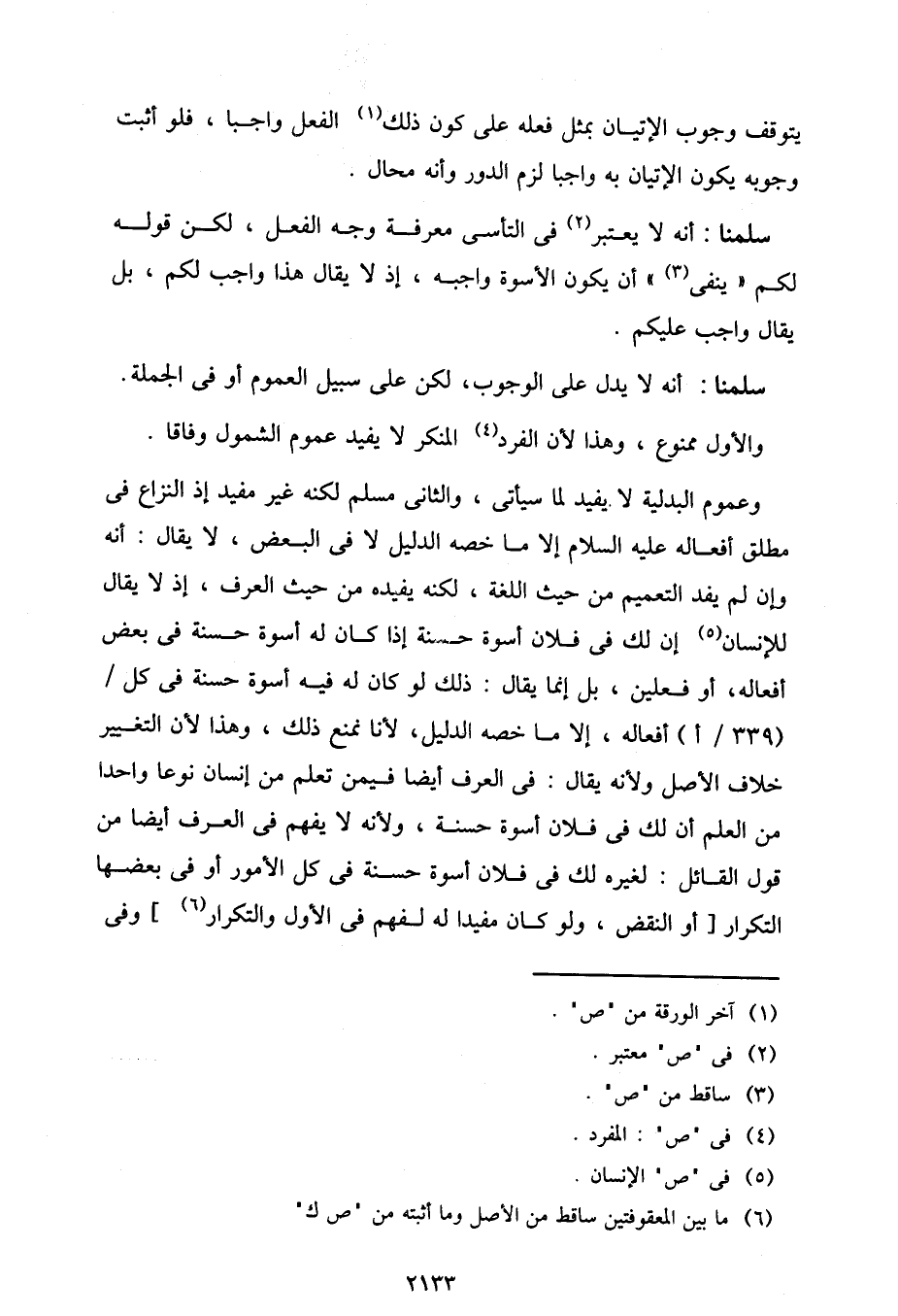 وعموم البدلية لا يفيد لما سيأتي، والثاني مسلم لكنه غير مفيد إذ النزاع في مطلق أفعاله عليه السلام إلا ما خصه الدليل لا في البعض، لا يقال: أنه وإن لم يفد التعميم من حيث اللغة، لكنه يفيده من حيث العرف، إذ لا يقال للإنسان إن لك في فلان أسوة حسنة إذا كان له أسوة حسنة في بعض أفعاله، أو فعلين، بل إنما يقال: ذلك لو كان له فيه أسوة حسنة في كل/ (339/أ) أفعاله، إلا ما خصه الدليل، لأنا نمنع ذلك، وهذا لأن التغيير خلاف الأصل ولأنه يقال: في العرف أيضًا فيمن تعلم من إنسان نوعًا واحدًا من العلم أن لك في فلان أسوة حسنة، ولأنه لا يفهم في العرف أيضًا من قول القائل: لغيره لك في فلان أسوة حسنة في كل الأمور أو في بعضها التكرار [أو النقض، ولو كان مفيدًا له لفهم في الأول والتكرار] وفي