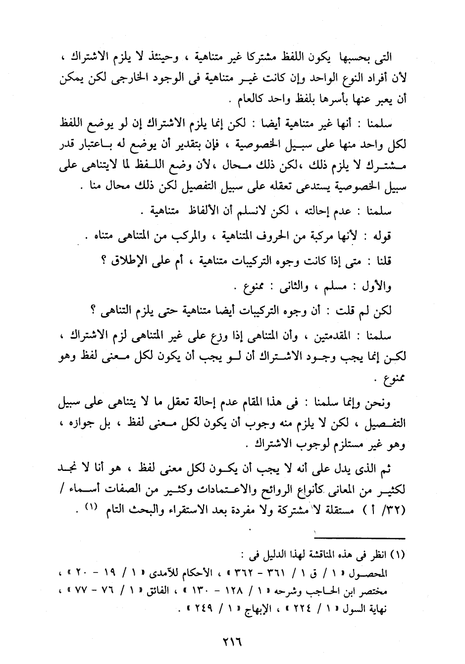 ثم الذي يدل على أنه لا يجب أن يكون لكل معنى لفظ، هو أنا لا نجد لكثير من المعاني كأنواع الروائح والاعتمادات وكثير من الصفات أسماء/ (32/أ) مستقلة لا مشتركة ولا مفردة بعد الاستقراء والبحث التام.