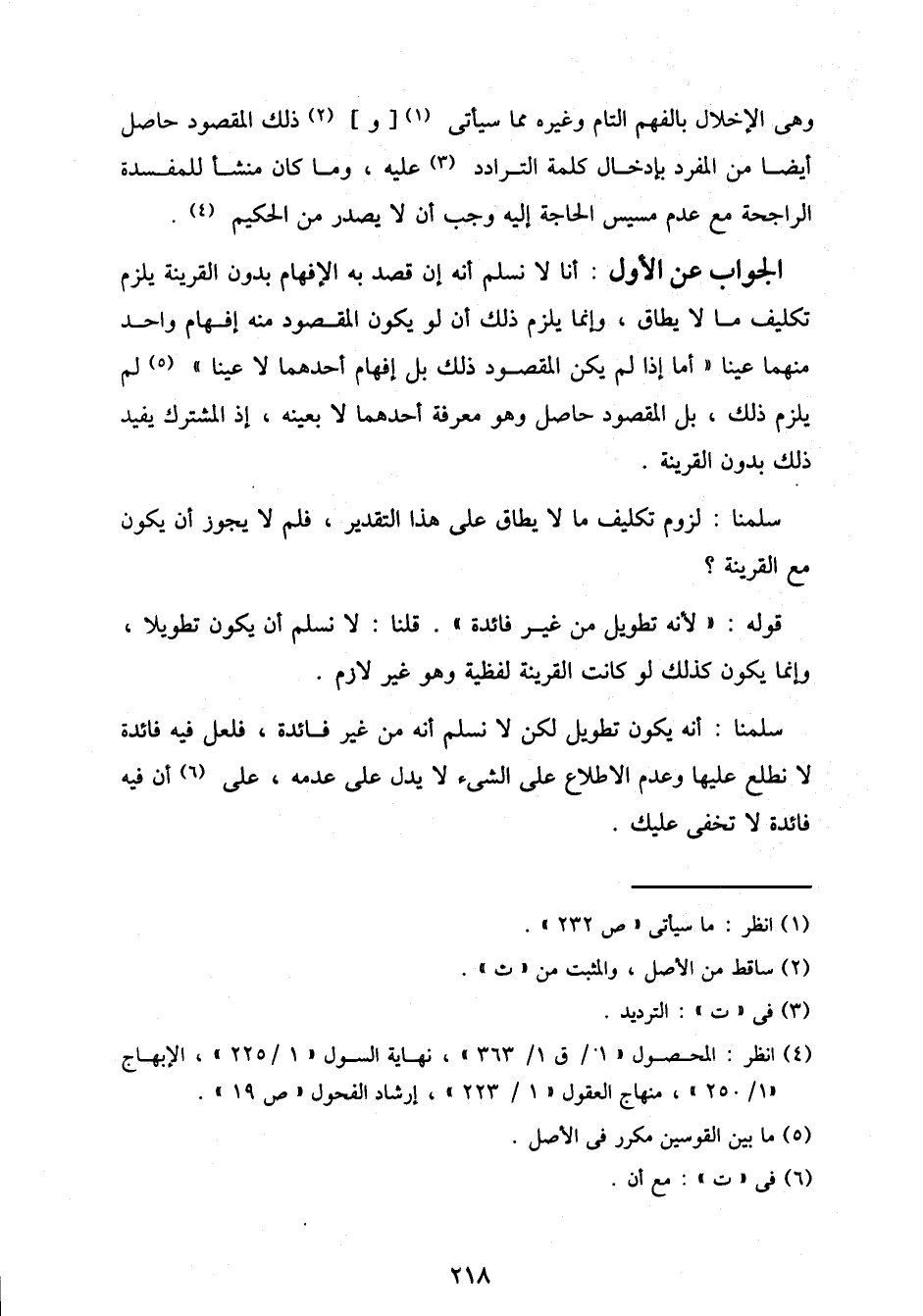 الجواب عن الأول: أنا لا نسلم أنه إن قصد به الإفهام بدون القرينة يلزم تكليف ما لا يطاق، وإنما يلزم ذلك أن لو يكون المقصود منه إفهام واحد منهما عينا "أما إذا لم يكن المقصود ذلك بل إفهام أحدهما لا عينا" لم يلزم ذلك، بل المقصود حاصل وهو معرفة أحدهما لا بعينه، إذ المشترك يفيد ذلك بدون القرينة.