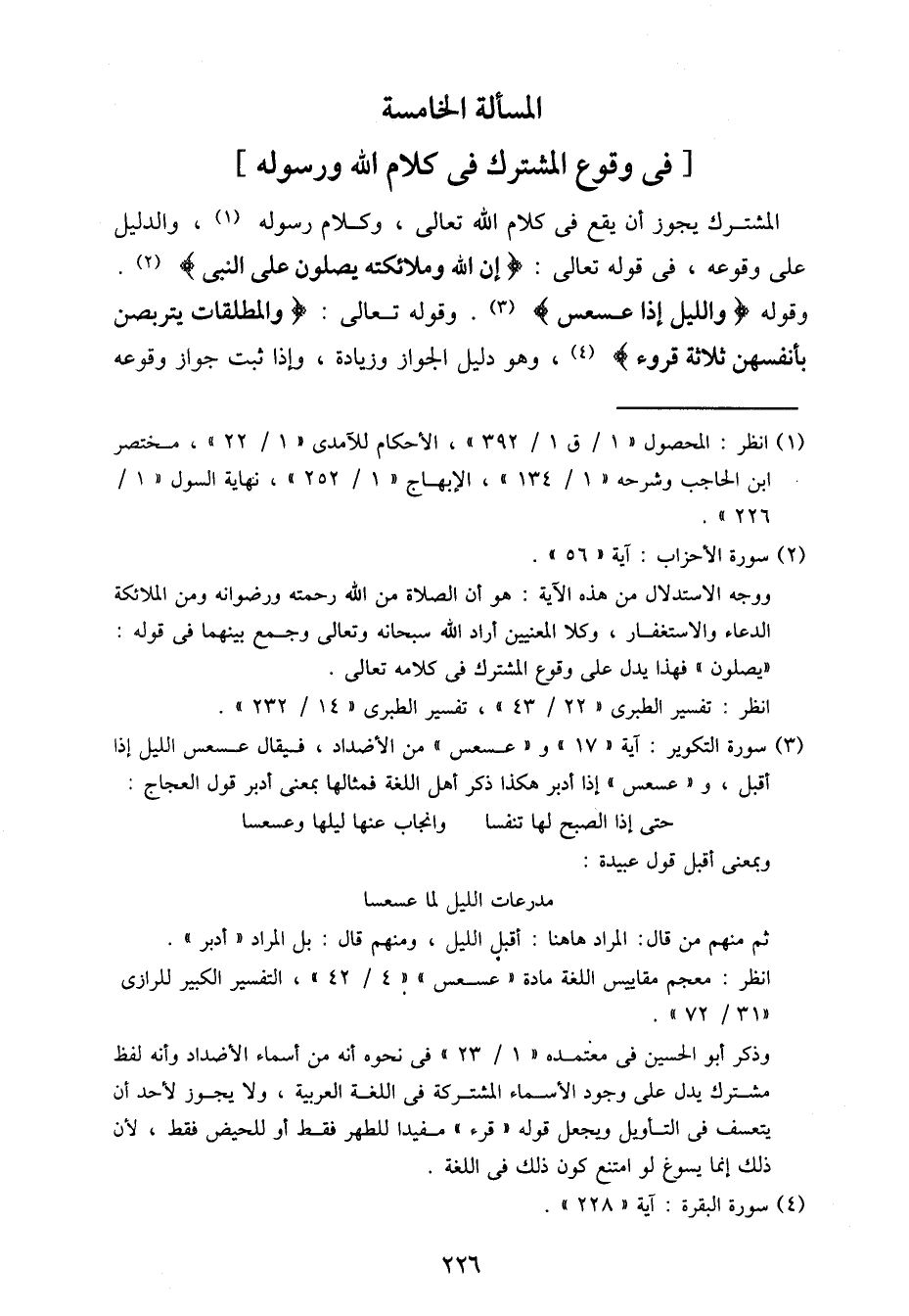 المشترك يجوز أن يقع في كلام الله تعالى، وكلام رسوله، والدليل على وقوعه، قوله تعالى: {إن الله وملائكته يصلون على النبي}. وقوله {والليل إذا عسعس}. وقوله تعالى: {والمطلقات يتربصن بأنفسهن ثلاثة قروء}، وهو دليل الجواز وزيادة، وإذا ثبت جواز وقوعه
