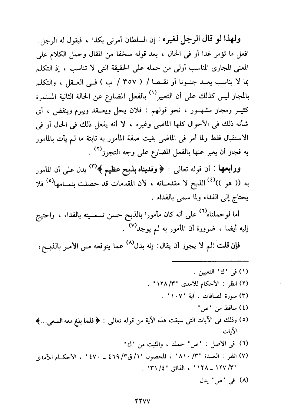 ولهذا لو قال الرجل لغيره: إن السلطان أمرني بكذا، فيقول له الرجل أفعل ما تؤمر غدا أو في الحال، يعد قوله سخفا من المقال وحمل الكلام على المعنى المجازي المناسب أولى من حمله على الحقيقة التي لا تناسب، إذ التكلم بما لا يناسب يعد جنونا أو ناقصا / (357/ب) في العقل، والتكلم بالمجاز ليس كذالك على أن التعبير بالفعل المضارع عن الحالة الثانية المستمرة كثير ومجاز مشهور، نحو قولهم: فلان يحل ويعقد ويبرم وينقض، أي شأنه ذلك في الأحوال كلها الماضي وغيره، لا أنه يفعل ذلك في الحال أو في الاستقبال فقط ولما أمر في الماضي بقيت صفة المأمور به ثابتة ما لم يأت بالمأمور به فجاز أن يعبر عنها بالفعل المضارع على وجوه التجوز.