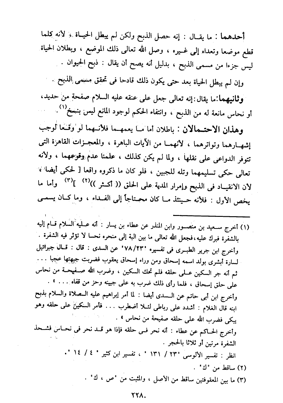 وهذان احتمالان: باطلان أما ما يعمهما فلأنهما لو وقعا لوجب إشهارهما وتواترهما، لأنهما من الآيات الباهرة، والمعجزات القاهرة التي تتوفر الدواعي على نقلها، ولما لا يكن كذلك، علمنا عدم وقوعهما، ولأنه تعالى حكي تسليمهما وتله للجبين، فلو كان ما ذكروه واقعا [لحكي أيضا لأن الانقياد في الذبح وإمرار المدية على الحلق (أكثر)] وأما ما يخص الأول: فلأنه حينئذ ما كان محتاجًا إلى الفداء، وما كان يسمى
