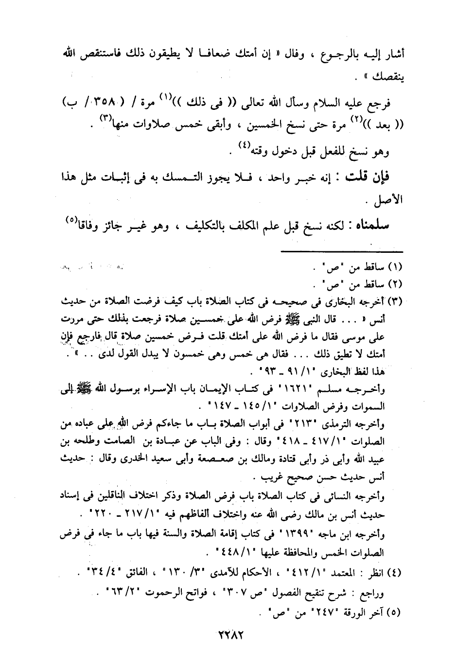 فرجع عليه السلام وسأل الله تعالى (في ذلك) مرة / (358/ب) (بعد) مرة حتى نسخ الخمسين، وأبقى خمس صلوات منها.