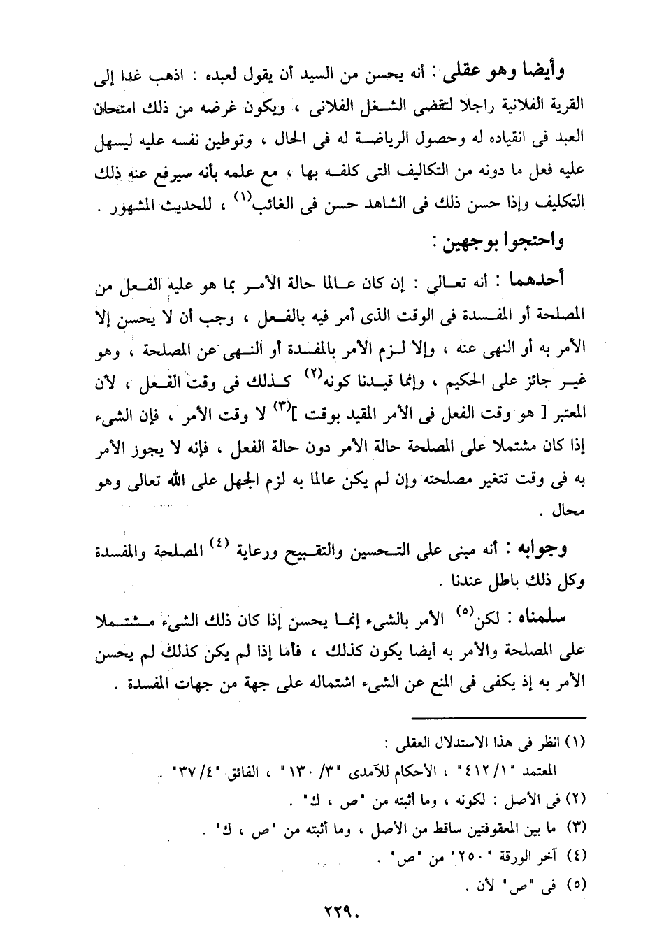 أحدهما: أنه تعالى: إن كان عالما حالة الأمر بما هو عليه الفعل من المصلحة أو المفسدة في الوقت الذي أمر فيه بالفعل، وجب أن لا يحسن إلا الأمر به أو النهي عنه، وإلا لزم الأمر بالمفسدة أو النهي عن المصلحة، وهو غير جائز على الحكيم، وإنما قيدنا كونه كذلك في وقت الفعل، لأن المعتبر [هو وقت الفعل في الأمر المقيد بوقت] لا وقت الأمر، فإن الشيء إذا كان مشتملا على المصلحة حالة الأمر دون حالة الفعل، فإنه لا يجوز الأمر به في وقت تغيير مصلحته وإن لم يكن عالما به لزم الجهل على الله تعالى وهو محال.