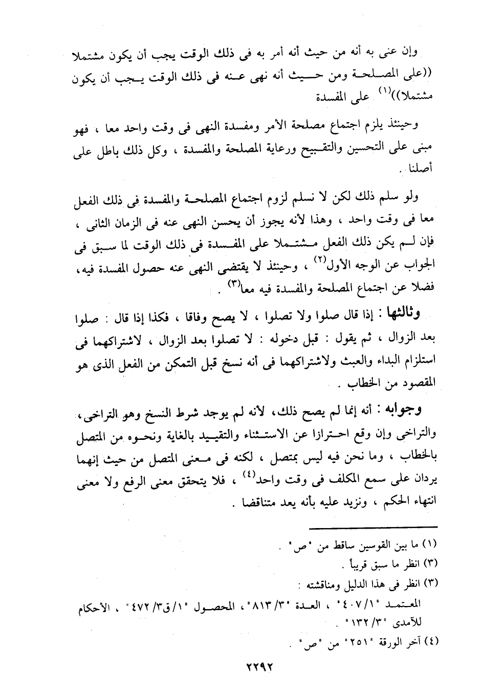 ولو سلم ذلك لكن لا نسلم لزوم اجتماع المصلحة والمفسدة في ذلك الفعل معا في وقت واحد، وهذا لا يجوز أن يحسن النهي عنه في الزمان الثاني، فإن لم يكن ذلك الفعل مشتملا على المفسدة في ذلك الوقت لما سبق في الجواب عن الوجه الأول، وحينئذ لا يقتضي النهي عنه حصول المفسدة فيه، فضلا عن اجتماع المصلحة والمفسدة فيه معا.