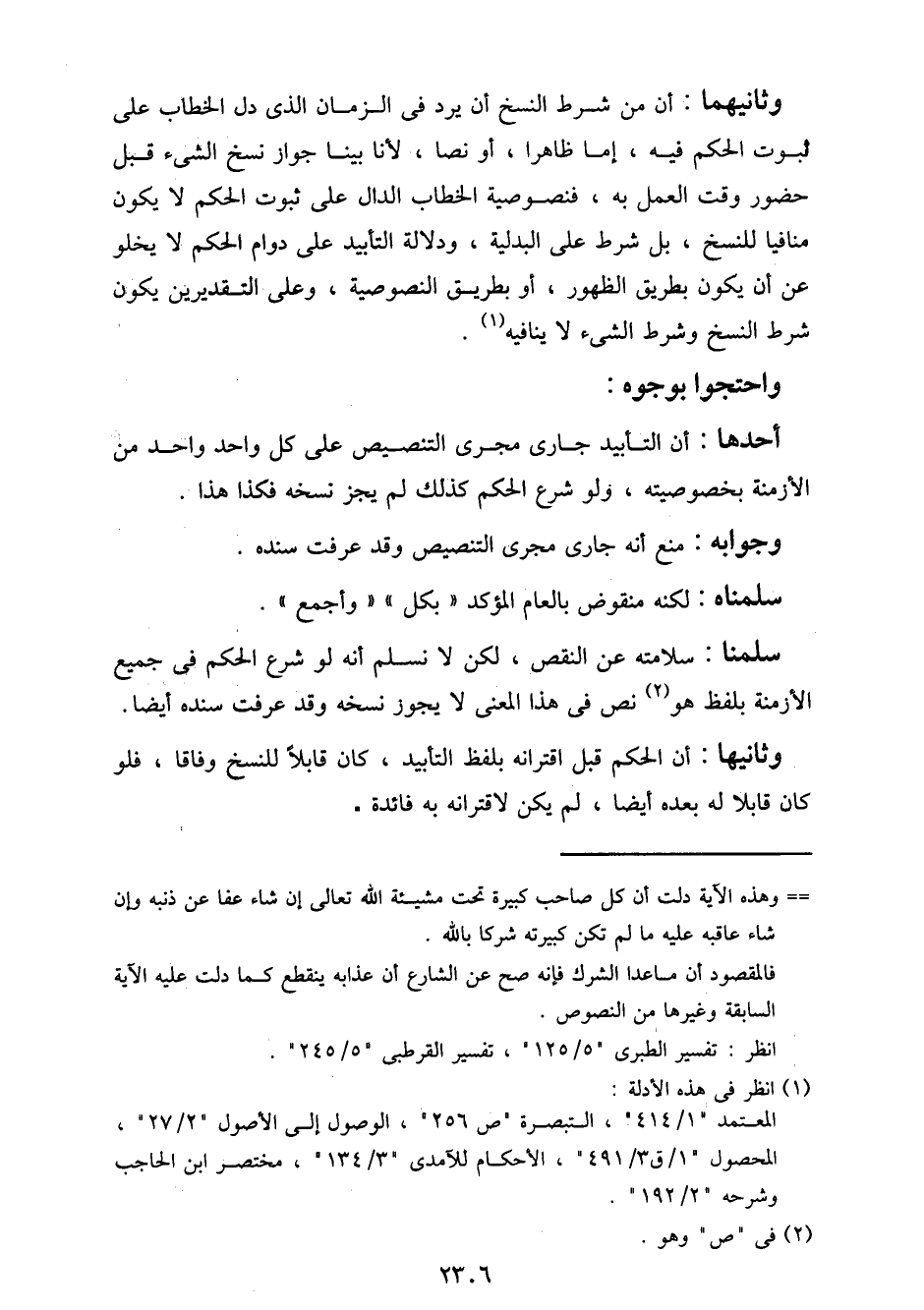 وثانيهما: أن من شرط النسخ أن يرد في الزمان الذي دل الخطاب على ثبوت الحكم فيه، إما ظاهرًا، أو نصًا، لأنا بينا جواز نسخ الشيء قبل حضور وقت العمل به، فنصوصية الخطاب الدال على ثبوت الحكم لا يكون منافيًا للنسخ، بل شرط على البدلية، ودلالة التأبيد على دوام الحكم لا يخلو عن أن يكون بطريق الظهور، أو بطريق النصوصية، وعلى التقديرين يكون شرط النسخ وشرط الشيء لا ينافيه.