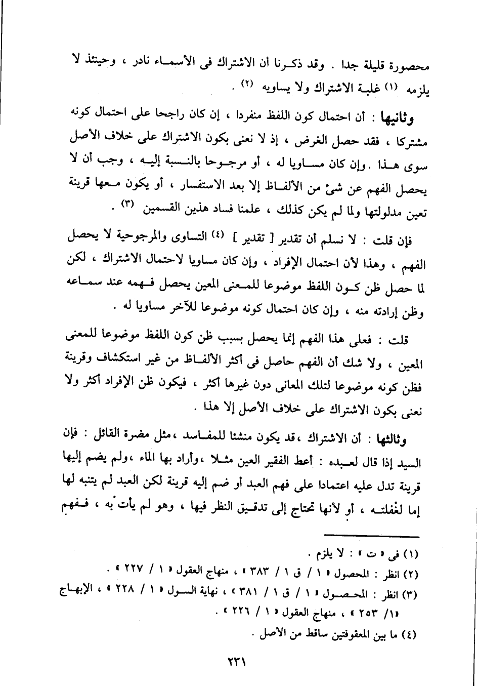 وثانيها: أن احتمال كون اللفظ منفردا، إن كان راجحا على احتمال كونه مشتركا، فقد حصل الغرض، إذ لا نعني بكون الاشتراك على خلاف الأصل سوى هذا. وإن كان مساويا له، أو مرجوحا بالنسبة إليه، وجب أن لا يحصل الفهم عن شيء من الألفاظ إلا بعد الاستفسار، أو يكون معها قرينة تعين مدلولتها ولما لم يكن كذلك، علمنا فساد هذين القسمين.