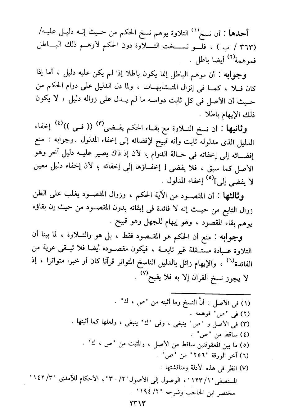 وثانيها: أن نسخ التلاوة مع بقاء الحكم يفضي "في" إخفاء الدليل الذي مدلوله ثابت وأنه قبيح لإفضائه إلى إخفاء المدلول. وجوابه: منع إفضائه إلى إخفائه في حالة الدوام، لأن إذ ذاك يصير عليه دليل آخر وهو الأصل كما سبق، فلا يفضي [إخفاؤها إلى إخفائه، لأن إخفاء دليل معين لا يفضي إلى] إخفاء المدلول.