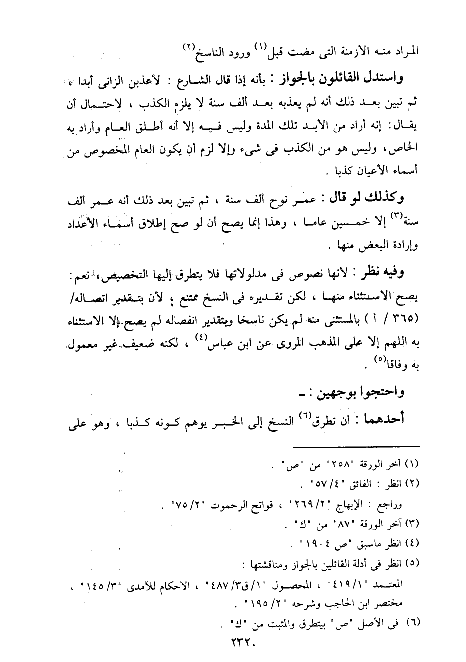 وفيه نظر: لأنها نصوص في مدلولاتها فلا يتطرق إليها التخصيص، نعم: يصح الاستثناء منها، لكن تقديره في النسخ ممتنع؛ لأن بتقدير اتصاله/ (365/ أ) بالمستثنى منه لم يكن ناسخًا وبتقدير انفصاله لم يصح إلا الاستثناء به اللهم إلا على المذهب المروي عن ابن عباس، لكنه ضعيف غير معمول به وفاقًا.