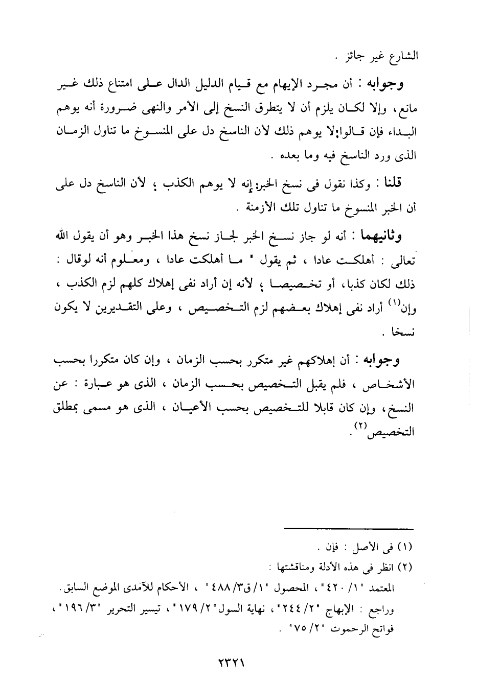 وجوابه: أن إهلاكهم غير متكرر بحسب الزمان، وإن كان متكررًا بحسب الأشخاص، فلم يقبل التخصيص بحسب الزمان، الذي هو عبارة: عن النسخ، وإن كان قابلاً للتخصيص بحسب الأعيان، الذي هو مسمى بمطلق التخصيص.