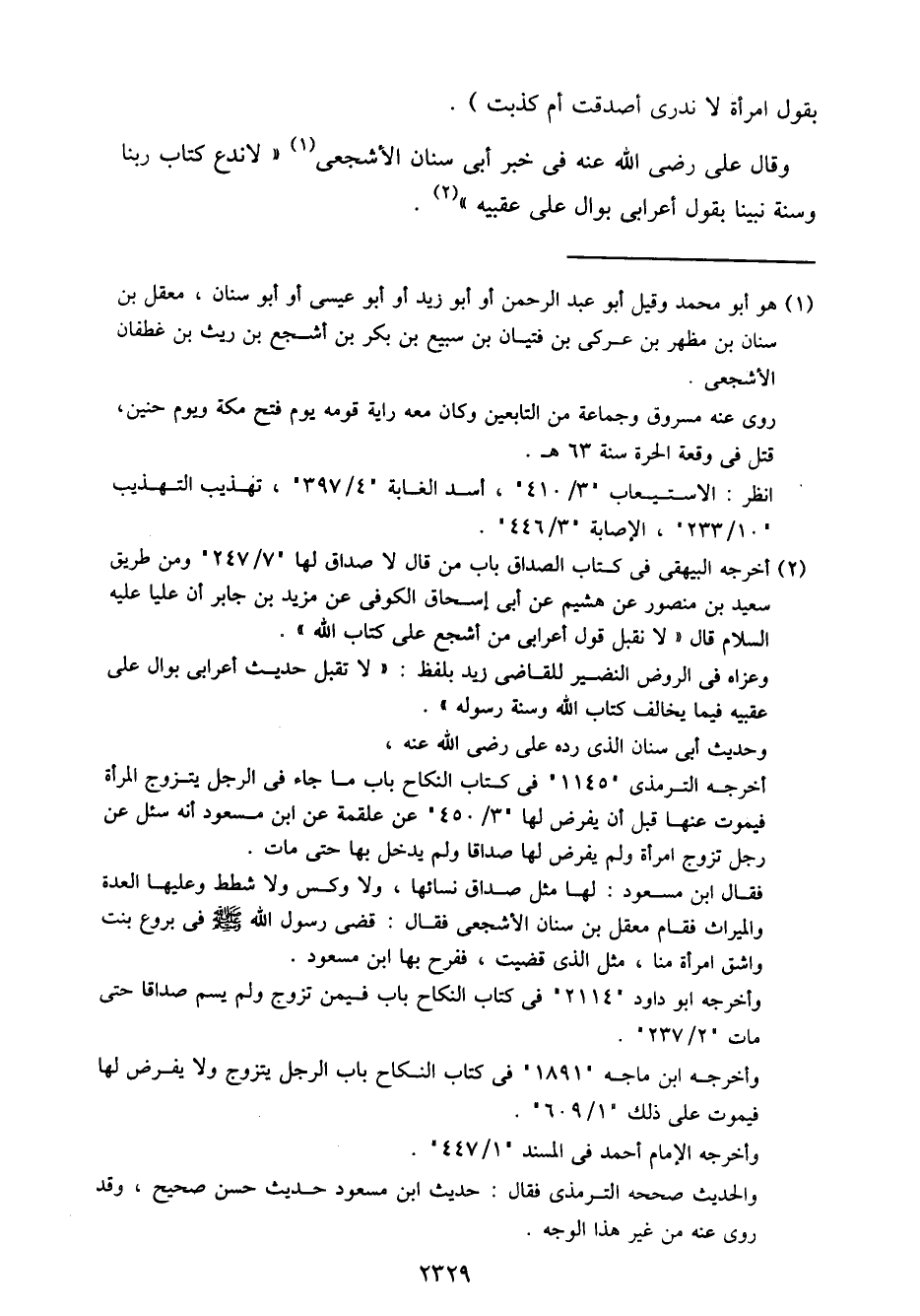 وقال علي رضي الله عنه في خبر أبي سنان الأشجعي "لا ندع كتاب ربنا وسنة نبينا بقول أعرابي بوال على عقبيه".