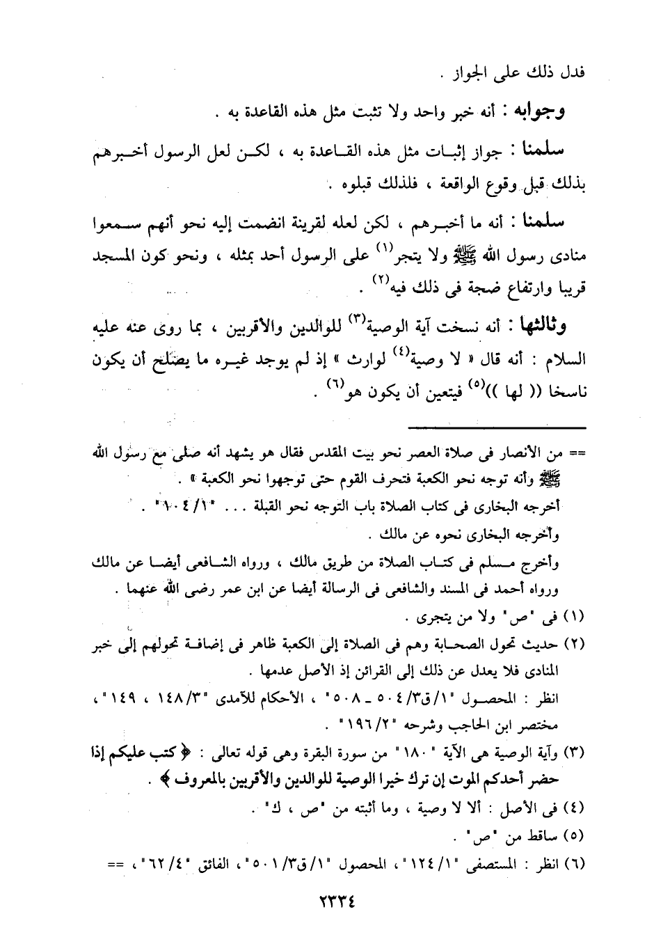 وثالثها: أنه نسخت آية الوصية للوالدين والأقربين، بما روى عنه عليه السلام: أنه قال "لا وصية لوارث" إذ لم يوجد غيره ما يصلح أن يكون ناسخًا "لها" فيتعين أن يكون هو.