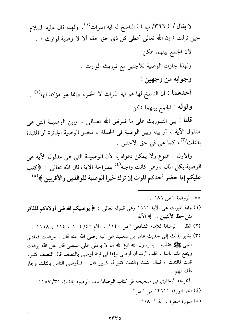 والأول: ممنوع ولا يمكن دعواه، لأن الوصية التي هي مدلول الآية هي الوصية بكل المال، وهي كانت واجبة بصراحة الآية، قال الله تعالى: {كتب عليكم إذا حضر أحدكم الموت إن ترك خيرا الوصية للوالدين والأقربين}.