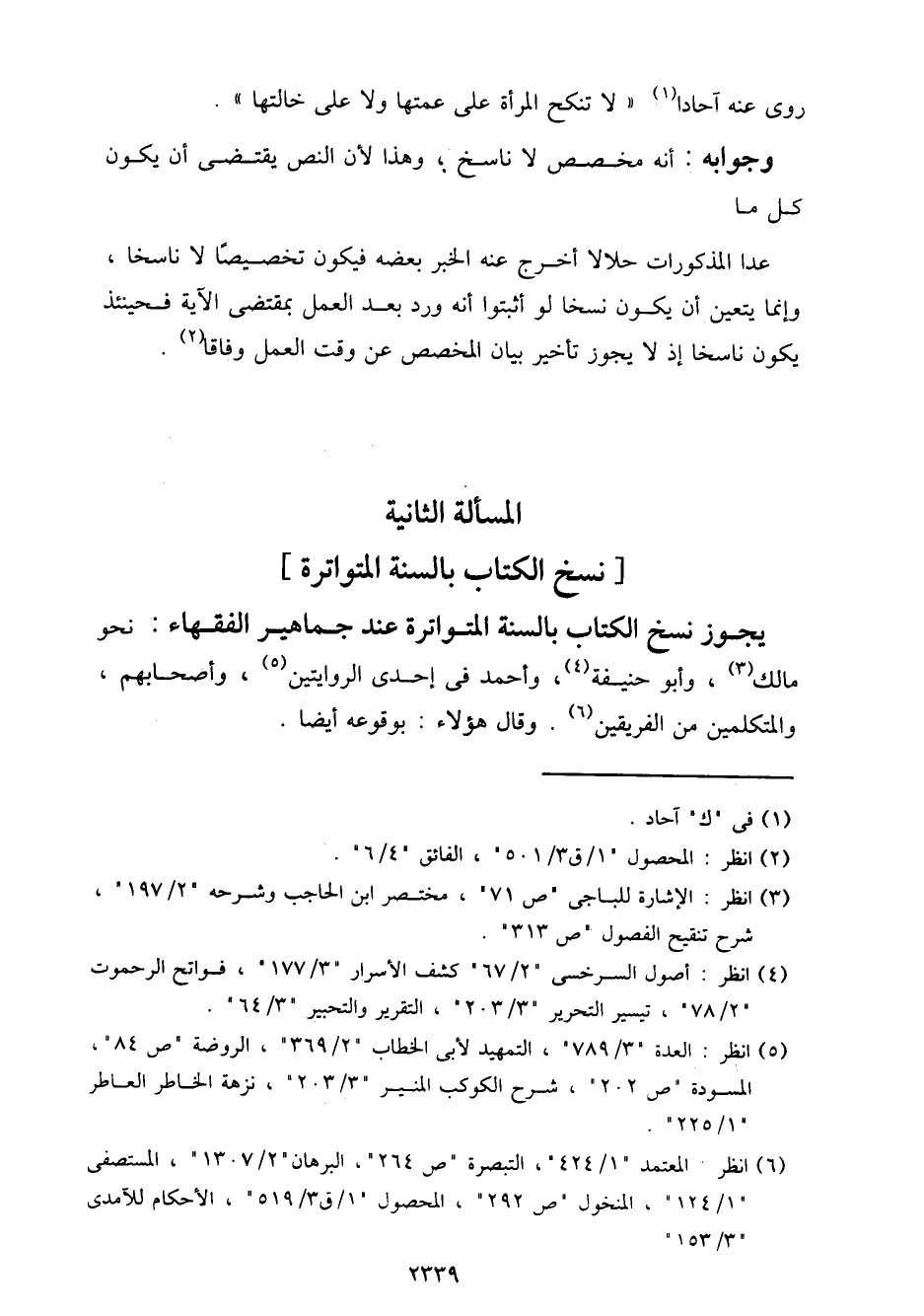 يجوز نسخ الكتاب بالسنة المتواترة عند جماهير الفقهاء: نحو مالك، وأبو حنيفة، وأحمد في إحدى الروايتين، وأصحابهم، والمتكلمين من الفريقين. وقال هؤلاء: بوقوعه أيضًا.