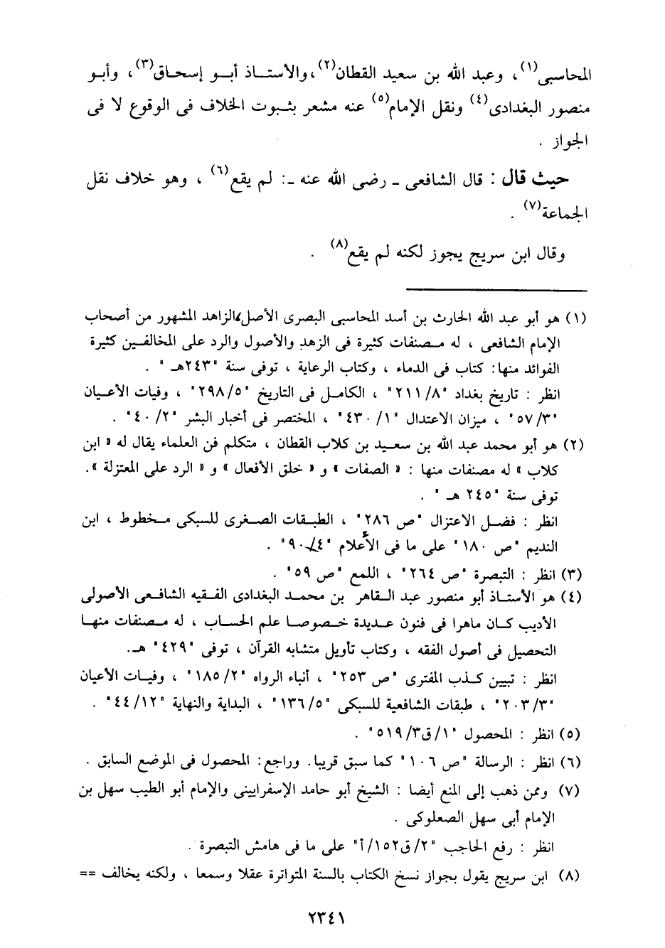 المحاسبي، وعبد الله بن سعيد القطان، والأستاذ أبو إسحاق، وأبو منصور البغدادي ونقل الإمام عنه مشعر بثبوت الخلاف في الوقوع لا في الجواز.