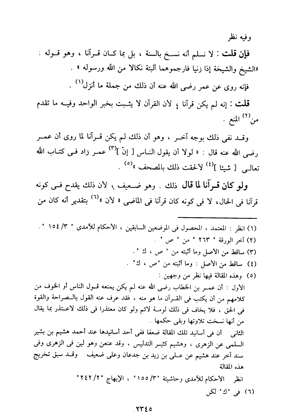 وقد نفى ذلك بوجه آخر، وهو أن ذلك لم يكن قرآنًا لما روى أن عمر رضي الله عنه قال: "لولا أن يقول الناس [إن] عمر زاد في كتاب الله تعالى [شيئًا] لألحقت ذلك بالمصحف".