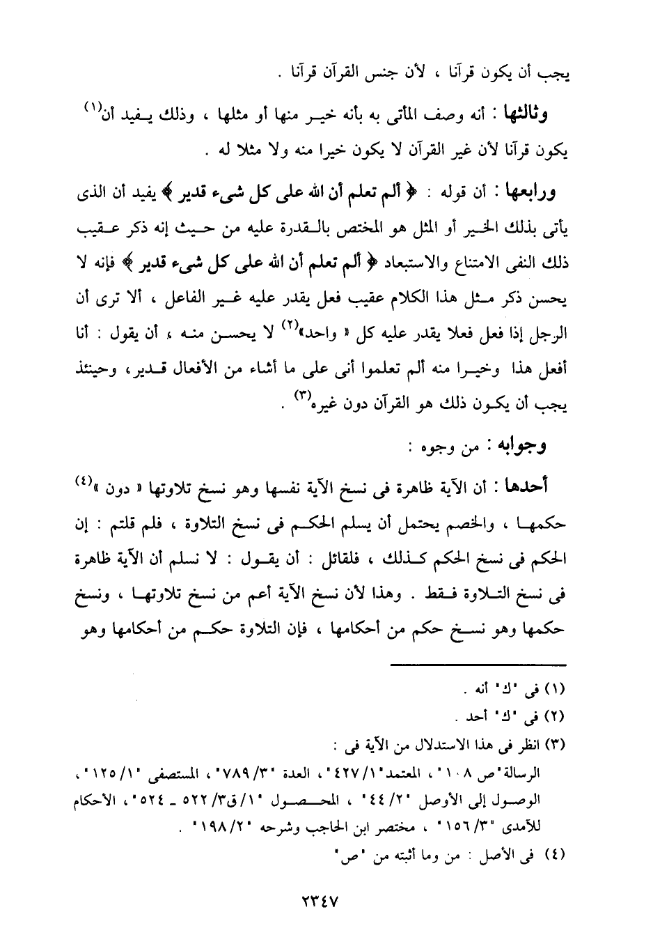 أحدها: أن الآية ظاهرة في نسخ الآية نفسها وهو نسخ تلاوتها "دون" حكمها، والخصم يحتمل أن يسلم الحكم في نسخ التلاوة، فلم قلتم: إن الحكم في نسخ الحكم كذلك، فلقائل: أن يقول: لا نسلم أن الآية ظاهرة في نسخ التلاوة فقط. وهذا لأن نسخ الآية أعم من نسخ تلاوتها، ونسخ حكمها وهو نسخ حكم من أحكامها، فإن التلاوة حكم من أحكامها وهو