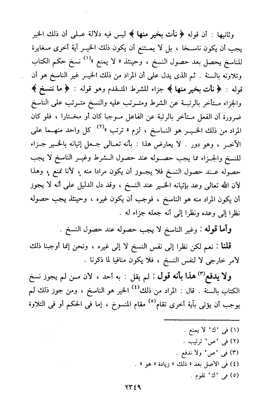 ولا يدفع هذا بأنه قول: لم يقل: به أحد، لأن من لم يجوز نسخ الكتاب بالسنة. قال: المراد من ذلك الخير هو الناسخ، ومن جوز ذلك لم يوجب أن يؤتى بآية أخرى تقام مقام المنسوخ، إما في الحكم أو في التلاوة