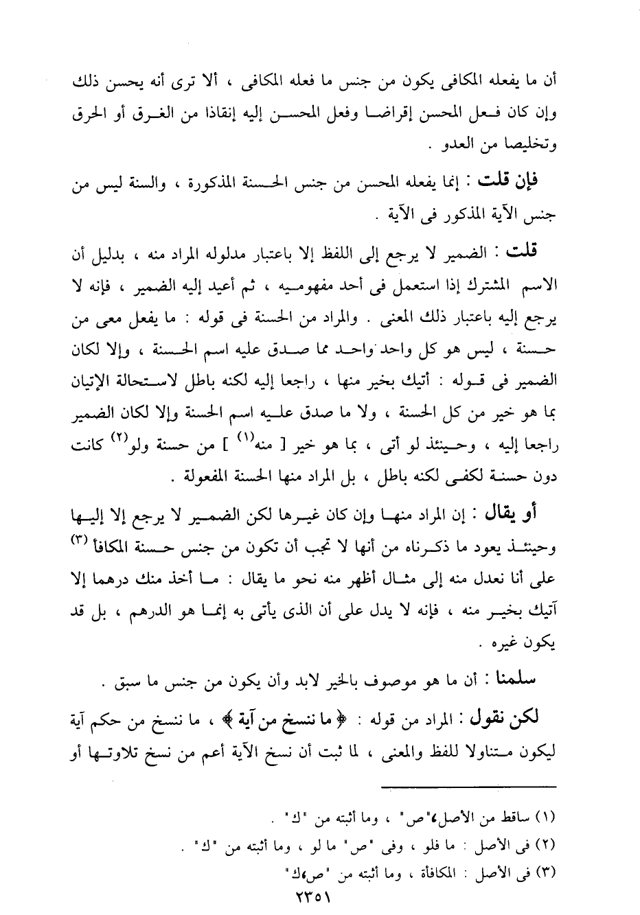 قلت: الضمير لا يرجع إلى اللفظ إلا باعتبار مدلوله المراد منه، بدليل أن الاسم المشترك إذا استعمل في أحد مفهوميه، ثم أعيد إليه الضمير، فإنه لا يرجع إليه باعتبار ذلك المعنى. والمراد من الحسنة في قوله: ما يفعل معي من حسنة، ليس هو كل واحد واحد مما صدق عليه اسم الحسنة، وإلا لكان الضمير في قوله: أتيك بخير منها، راجعًا إليه لكنه باطل لاستحالة الإتيان بما هو خير من كل الحسنة، ولا ما صدق عليه اسم الحسنة وإلا لكان الضمير راجعًا إليه، وحينئذ لو أتى، بما هو خير [منه] من حسنة ولو كانت دون حسنة لكفى لكنه باطل، بل المراد منها الحسنة المفعولة.