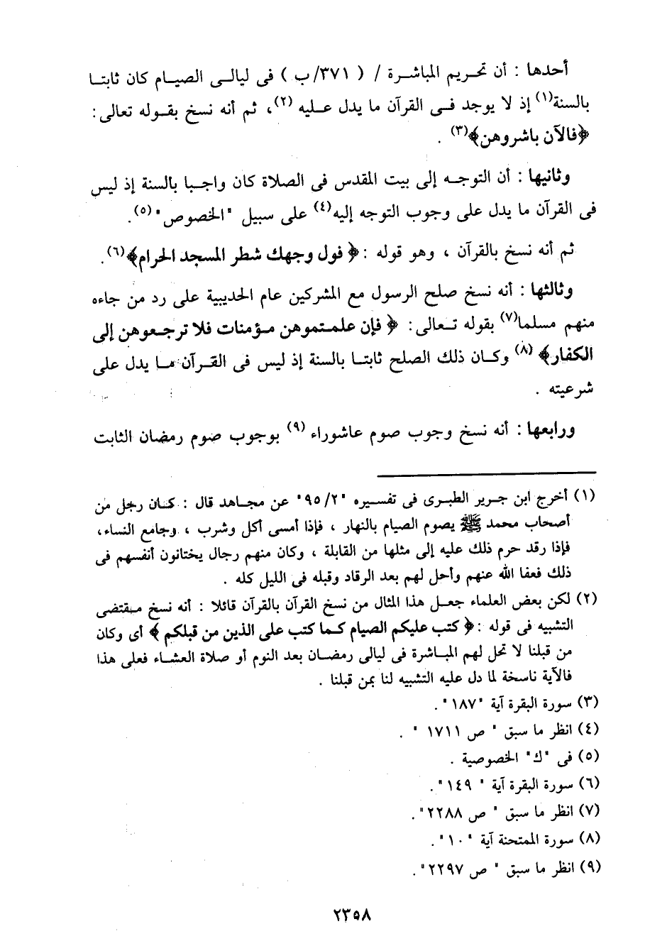 أحدها: أن تحريم المباشرة/ (371/ ب) في ليالي الصيام كان ثابتًا بالسنة إذ لا يوجد في القرآن ما يدل عليه، ثم أنه نسخ بقوله تعالى: {فالآن باشروهن}.
