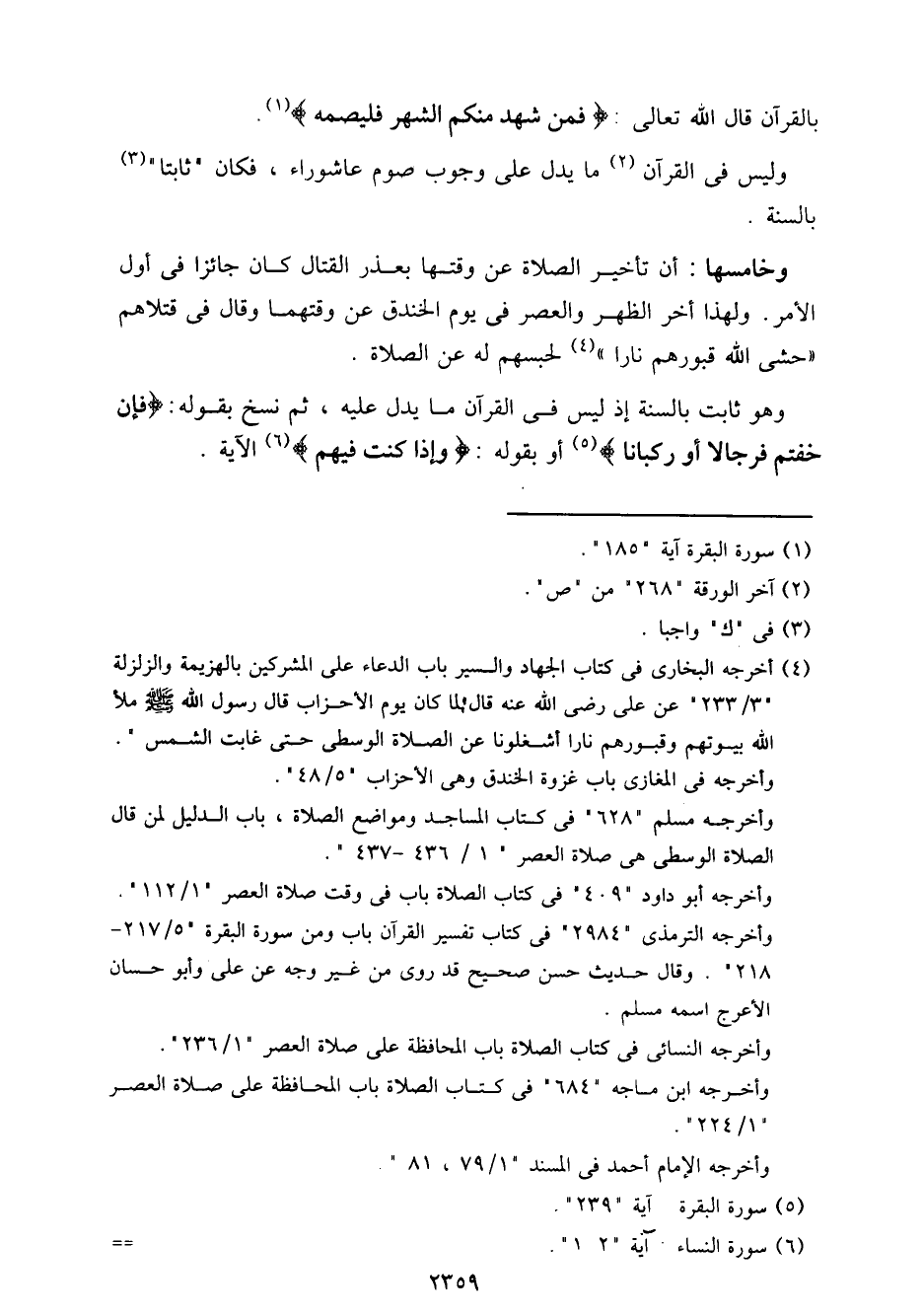 وخامسها: أن تأخير الصلاة عن وقتها بعذر القتال كان جائزًا في أول الأمر. ولهذا أخر الظهر والعصر في يوم الخندق عن وقتهما وقال في قتلاهم "حشى الله قبورهم نارًا" لحبسهم له عن الصلاة.