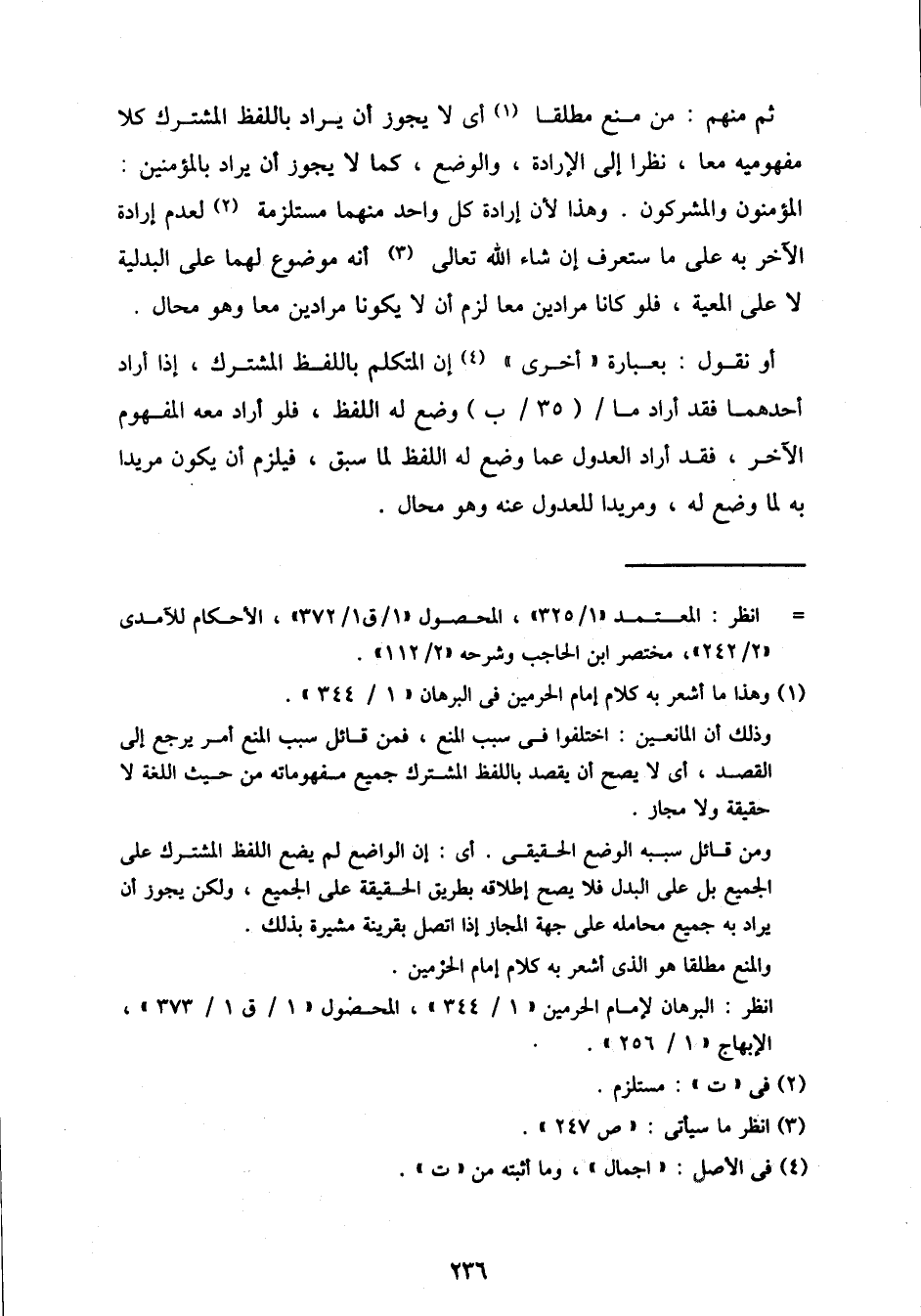 ثم منهم: من منع مطلقا أي لا يجوز أن يراد باللفظ المشترك كلا مفهوميه معا، نظرا إلى الإرادة، والوضع، كما لا يجوز أن يراد بالمؤمنين: المؤمنون والمشركون. وهذا لأن إرادة كل واحد منهما مستلزمة لعدم إرادة الآخر به على ما ستعرف إن شاء الله تعالى أنه موضوع لهما على البدلية لا على المعية، فلو كانا مرادين معا لزم أن لا يكونا مرادين معا وهو محال.