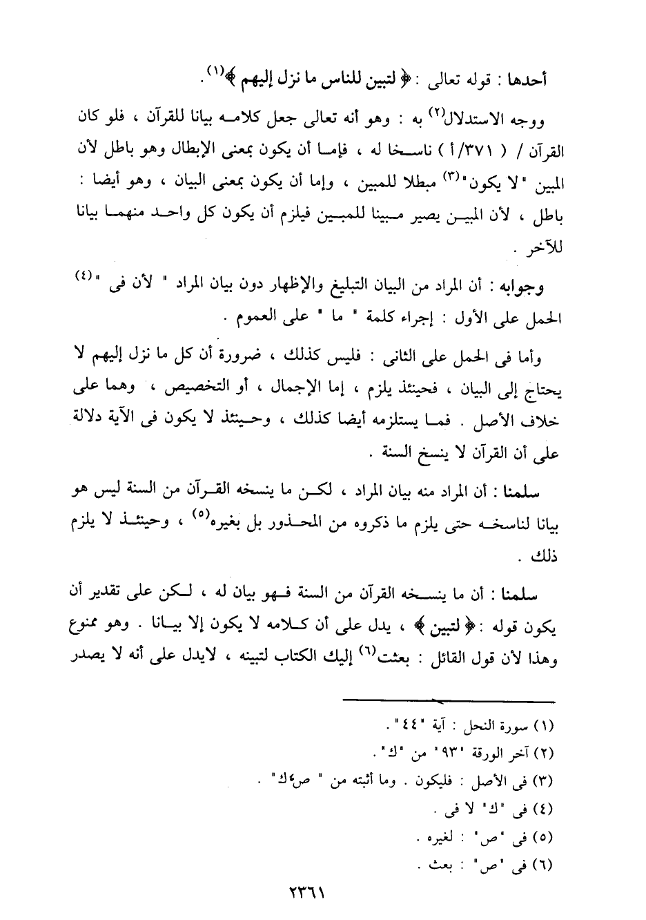ووجه الاستدلال به: وهو أنه تعالى جعل كلامه بيانًا للقرآن، فلو كان القرآن/ (371/ أ) ناسخًا له، فإما أن يكون بمعنى الإبطال وهو باطل لأن المبين "لا يكون" مبطلاً للمبين، وإما أن يكون بمعنى البيان، وهو أيضًا: باطل، لأن المبين يصير مبينًا للمبين فيلزم أن يكون كل واحد منهما بيانًا للآخر.