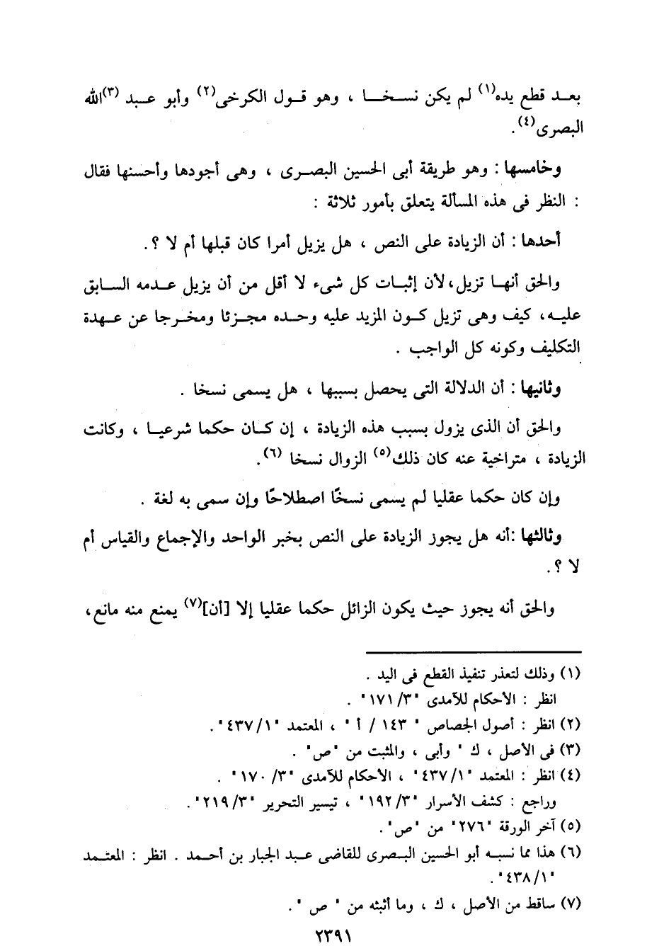 وخامسها: وهو طريقة أبي الحسين البصري، وهي أجودها وأحسنها فقال: النظر في هذه المسألة يتعلق بأمور ثلاثة: