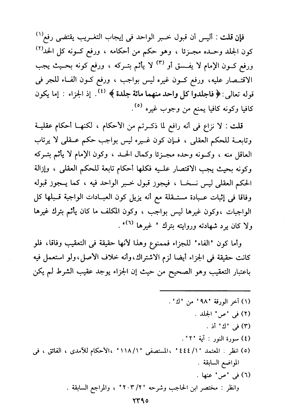 فإن قلت: أليس أن قبول خبر الواحد في إيجاب التغريب يقتضي رفع كون الجلد وحده مجزئًا، وهو حكم من أحكامه، وروفع كونه كل الحد ورفع كون الإمام لا يفسق أو لا يأثم بتركه، ورفع كونه بحيث يجب الاقتصار عليه، ورفع كون غيره ليس بواجب، ورفع كون الفاء للجر في قوله تعالى: {فاجلدوا كل واحد منهما مائة جلدة}. إذ الجزاء: إما يكون كافيًا وكونه كافيًا يمنع من وجوب غيره.