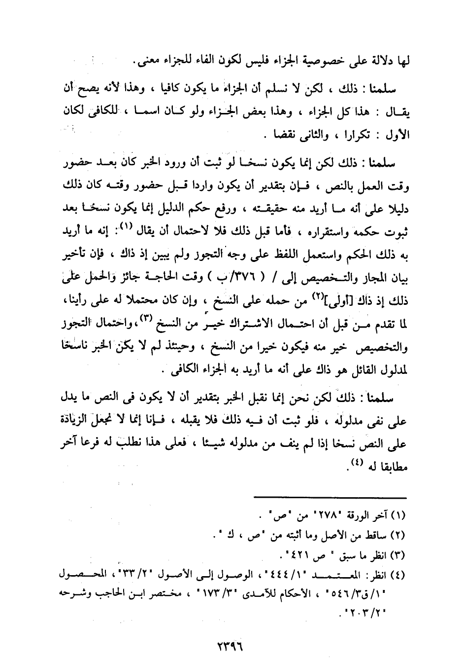 سلمنا: ذلك لكن إنما يكون نسخًا لو ثبت أن ورود الخبر كان بعد حضور وقت العمل بالنص، فإن بتقدير أن يكون واردًا قبل حضور وقته كان ذلك دليلاً على أنه ما أريد منه حقيقته، ورفع حكم الدليل إنما يكون نسخًا بعد ثبوت حكمه واستقراره، فأما قبل ذلك فلا لاحتمال أن يقال: إنه ما أريد به ذلك الحكم واستعمل اللفظ على وجه التجوز ولم يبين إذ ذاك، فإن تأخير بيان المجاز والتخصيص إلى/ (376/ ب) وقت الحاجة جائز والحمل على ذلك إذ ذاك [أولى] من حمله على النسخ، وإن كان محتملاً له على رأينا، لما تقدم من قبل أن احتمال الاشتراك خير من النسخ، واحتمال التجوز والتخصيص خير منه فيكون خيرًا من النسخ، وحينئذ لم لا يكن الخبر ناسخًا لمدلول القائل هو ذاك على أنه ما أريد به الجزاء الكافي.