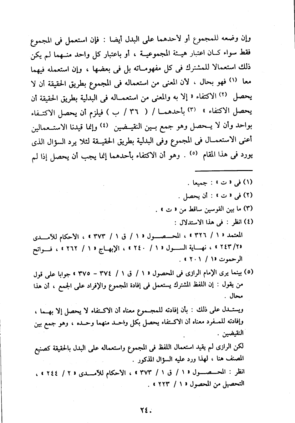 وإن وضعه للمجموع أو لأحدهما على البدل أيضا: فإن استعمل في المجموع فقط سواء كان اعتبار هيئة المجموعية، أو باعتبار كل واحد منهما لم يكن ذلك استعمالا للمشترك في كل مفهوماته بل في بعضها، وإن استعمله فيهما معا فهو بحال، لأن المعنى من استعماله في المجموع بطريق الحقيقة أن لا يحصل الاكتفاء "إلا به والمعنى من استعماله في البدلية طريق الحقيقة أن يحصل الاكتفاء" بأحدهما/ (36/ب) فيلزم أن يحصل الاكتفاء بواحد وأن لا يحصل وهو جمع يبن النقيضين وإنما قيدنا الاستعمالين أعني الاستعمال في المجموع وفي البدلية بطريق الحقيقة لئلا يرد السؤال الذي يورد في هذا المقام. وهو أن الاكتفاء بأحدهما إنما يجب أن يحصل إذا لم