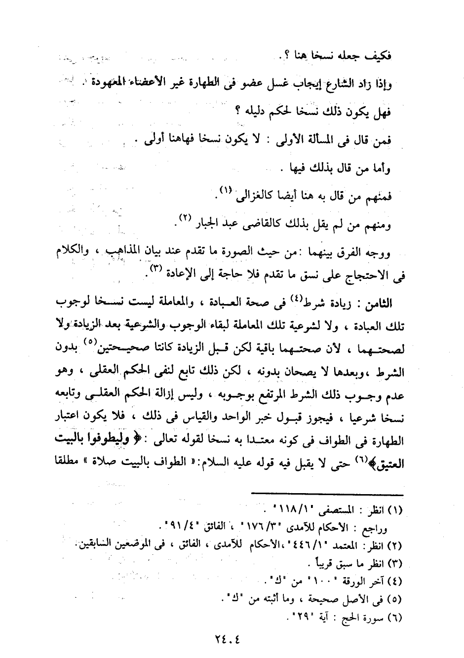 الثامن: زيادة شرط في صحة العبادة، والمعاملة ليست نسخًا لوجوب تلك العبادة، ولا لشرعية تلك المعاملة لبقاء الوجوب والشرعية بعد الزيادة ولا لصحتهما، لأن صحتهما باقية لكن قبل الزيادة كانتا صحيحتين بدون الشرط، وبعدها لا يصحان بدونه، لكن ذلك تابع لنفي الحكم العقلي، وهو عدم وجوب ذلك الشرط المرتفع بوجوبه، وليس إزالة الحكم العقلي وتابعه نسخًا شرعيًا، فيجوز قبول خبر الواحد والقياس في ذلك، فلا يكون اعتبار الطهارة في الطواف في كونه معتدًا به نسخًا لقوله تعالى: {وليطوفوا بالبيت العتيق} حتى لا يقبل فيه قوله عليه السلام: "الطواف بالبيت صلاة" مطلقًا
