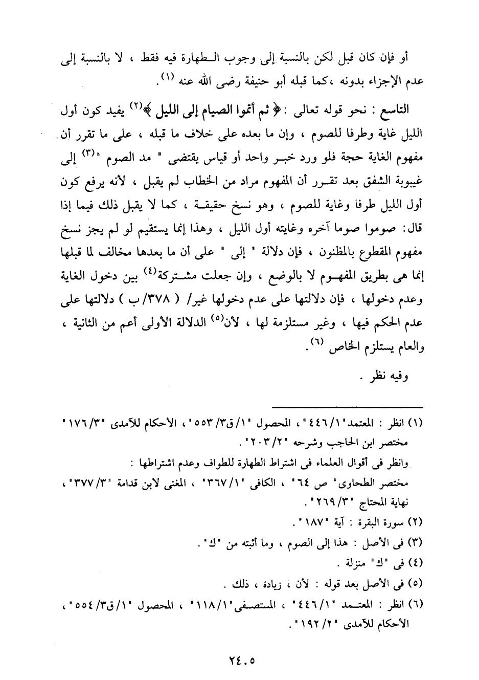 التاسع: نحو قوله تعالى: {ثم أتموا الصيام إلى الليل} يفيد كون أول الليل غاية وطرفًا للصوم، وإن بعده على خلاف ما قبله، على ما تقرر أن مفهوم الغاية حجة فلو ورد خبر واحد أو قياس يقتضي "مد الصوم" إلى غيبوبة الشفق بعد تقرر أن المفهوم مراد من الخطاب لم يقبل، لأنه يرفع كون أول الليل طرفًا وغاية للصوم، وهو نسخ حقيقة، كما لا يقبل ذلك فيما إذا قال: صوموا صومًا آخره وغايته أول الليل، وهذا إنما يستقيم لو لم يجز نسخ مفهوم المقطوع بالمظنون، فإن دلالة "إلى" على أن ما بعدها مخالف لما قبلها إنما هي بطريق المفهوم لا بالوضع، وإن جعلت مشتركة بين دخول الغاية وعدم دخولها، فإن دلالتها على عدم دخولها غير/ (378/ ب) دلالتها على عدم الحكم فيها، وغير مستلزمة لها، لأن الدلالة الأولى أعم من الثانية، والعام يستلزم الخاص.