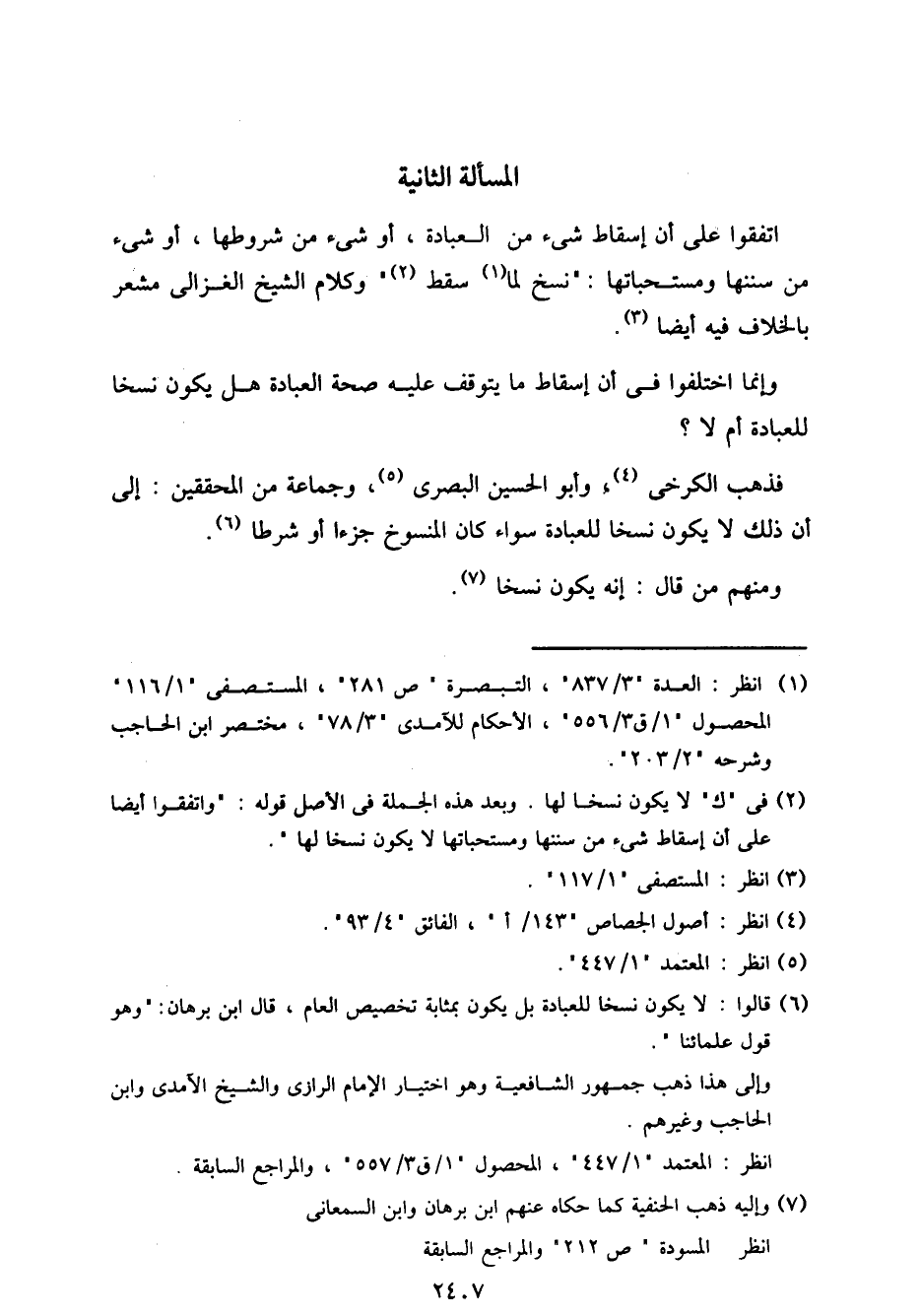 اتفقوا على أن إسقاط شيء من العبادة، أو شيء من شروطها، أو شيء من سننها ومستحباتها: "نسخ لما سقط" وكلام الشيخ الغزالي مشعر بالخلاف فيه أيضًا.