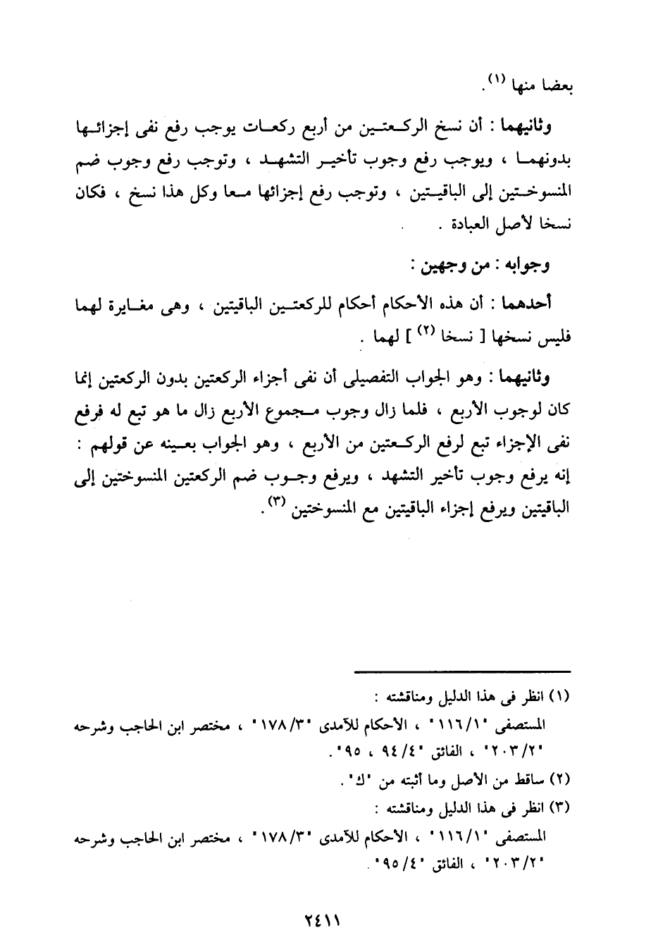 وثانيهما: وهو الجواب التفصيلي أن نفي أجزاء الركعتين بدون الركعتين إنما كان لوجوب الأربع، فلما زال وجوب مجموع الأربع زال ما هو تبع له فرفع نفي الإجزاء تبع لرفع الركعتين من الأربع، وهو الجواب بعينه عن قولهم: إنه يرفع وجوب تأخير التشهد، ويرفع وجوب ضم الركعتين المنسوختين إلى الباقيتين ويرفع إجزاء الباقيتين مع المنسوختين.