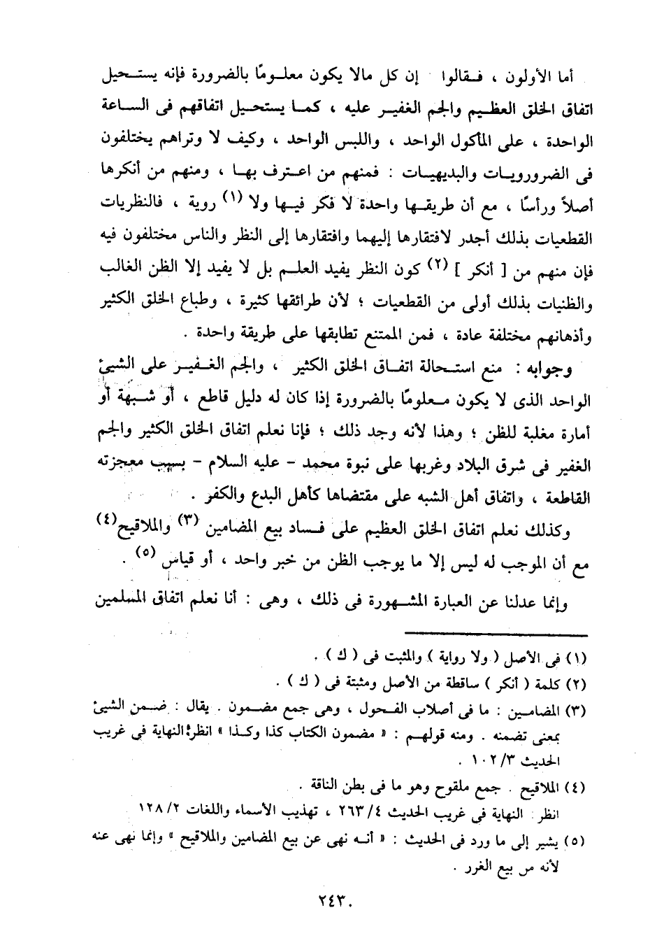 أما الأولون، فقالوا: إن كل ما لا يكون معلومًا بالضرورة فإنه يستحيل اتفاق الخلق العظيم والجم الغفير عليه، كما يستحيل اتفاقهم في الساعة الواحدة، على المأكول الواحد، واللبس الواحد، وكيف لا وتراهم يختلفون في الضروريات والبديهيات: فمنهم من اعترف بها، ومنهم من أنكرها أصلاً ورأسًا، مع أن طريقها واحدة لا فكر فيها ولا روية، فالنظريات القطعيات بذلك أجدر لافتقارها إليهما وافتقارها إلى النظر والناس مختلفون فيه فإن منهم من [أنكر] كون النظر يفيد العلم بل لا يفيد إلا الظن الغالب والظنيات بذلك أولى من القطعيات؛ لأن طرائقها كثيرة، وطباع الخلق الكثير وأذهانهم مختلفة عادة، فمن الممتنع تطابقها على طريقة واحدة.