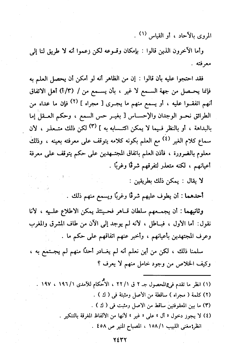 وثانيهما: أن يجمعهم سلطان قاهر فحينئذ يمكن الاطلاع عليه، لأنا نقول: أما الأول، فباطل، لأنه لم يوجد إلى الآن من طاف المشرق والمغرب وعرف المجتهدين بأعيانهم، وأخبر عنهم اتفاقهم على حكم ما.