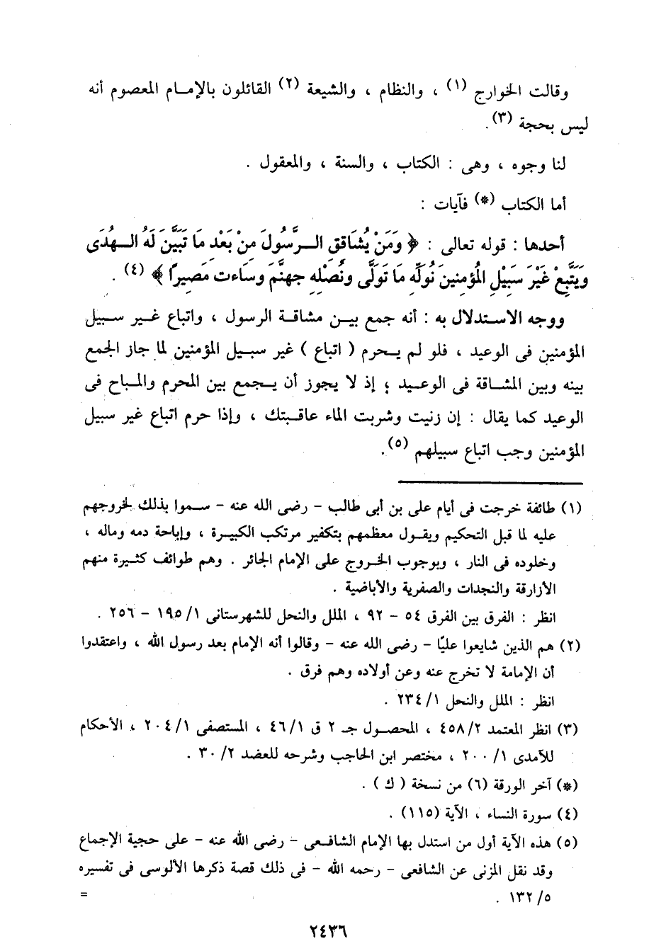 ووجه الاستدلال به: أنه جمع بين مشاقة الرسول، وإتباع غير سبيل المؤمنين في الوعيد، فلو لم يحرم (اتباع) غير سبيل المؤمنين لما جاز الجمع بينه وبين المشاقة في الوعيد؛ إذ لا يجوز أن يجمع بين المحرم والمباح في الوعيد كما يقال: إن زنيت وشربت الماء عاقبتك، وإذا حرم اتباع غير سبيل المؤمنين وجب اتباع سبيلهم.