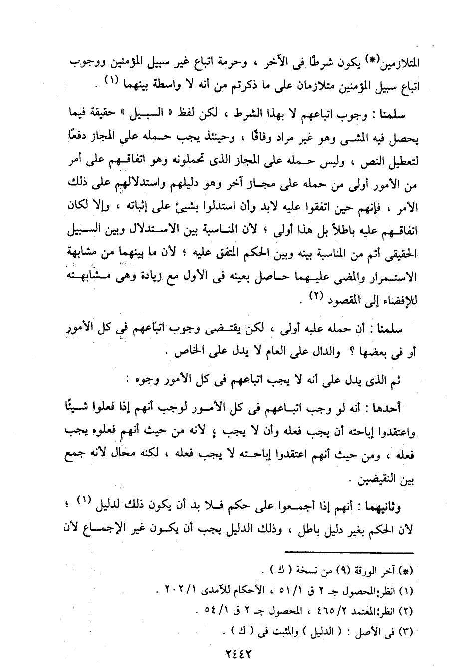 سلمنا: وجوب اتباعهم لا بهذا الشرط، لكن لفظ "السبيل" حقيقة فيما يحصل فيه المشي وهو غير مراد وفاقًا، وحينئذ يجب حمله على المجاز دفعًا لتعطيل النص، وليس حمله على المجاز الذي تحملونه وهو اتفاقهم على أمر من الأمور أولى من حمله على مجاز آخر وهو دليلهم واستدلالهم على ذلك الأمر، فإنهم حين اتفقوا عليه لا بد وأن استدلوا بشيء على إثباته، وإلا لكان اتفاقهم عليه باطلاً بل هذا أولى؛ لأن المناسبة بين الاستدلال وبين السبيل الحقيقي أتم من المناسبة بينه وبين الحكم المتفق عليه؛ لأن ما بينهما من مشابهة الاستمرار والمضي عليهما حاصل بعينه في الأول مع زيادة وهي مشابهته للإفضاء إلى المقصود.