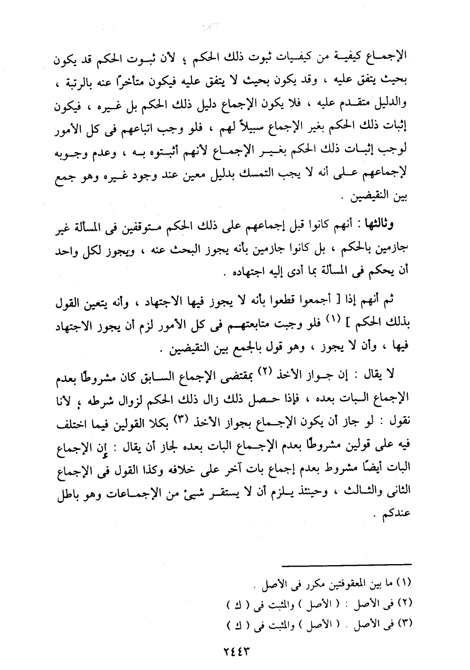 الإجماع كيفية من كيفيات ثبوت ذلك الحكم؛ لأن ثبوت الحكم قد يكون بحيث يتفق عليه، وقد يكون بحيث لا يتفق عليه فيكون متأخرًا عنه بالرتبة، والدليل متقدم عليه، فلا يكون الإجماع دليل ذلك الحكم بل غيره، فيكون إثبات ذلك الحكم بغير الإجماع سبيلاً لهم، فلو وجب اتباعهم في كل الأمور لوجب إثبات ذلك الحكم بغير الإجماع لأنهم أثبتوه به، وعدم وجوبه لإجماعهم على أنه لا يجب التمسك بدليل معين عند وجود غيره وهو جمع بين النقيضين.