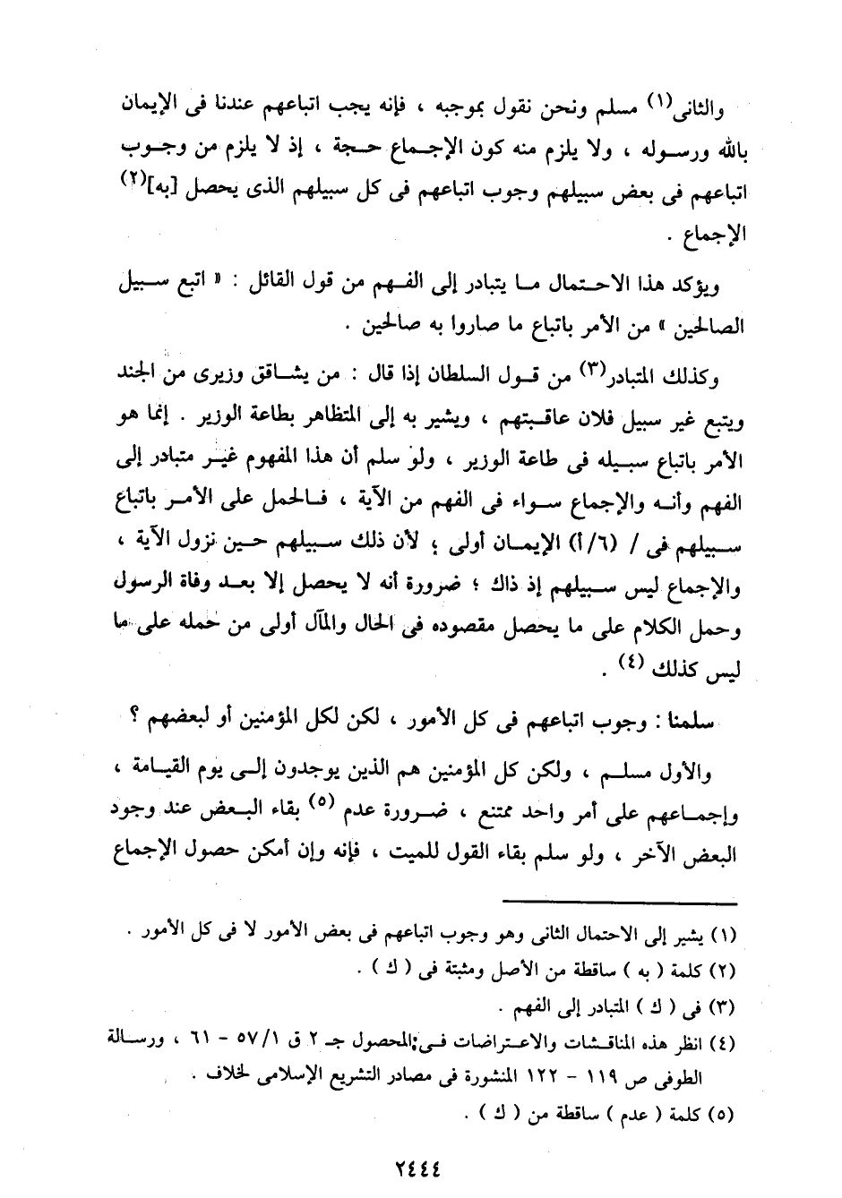 وكذلك المتبادر من قول السلطان إذا قال: من يشاقق وزيري من الجند ويتبع غير سبيل فلان عاقبتهم، ويشير به إلى المتظاهر بطاعة الوزير. إنما هو الأمر باتباع سبيله في طاعة الوزير، ولو سلم أن هذا المفهوم غير متبادر إلى الفهم وأنه والإجماع سواء في الفهم من الآية، فالحمل على الأمر باتباع سبيلهم في/ (6/ أ) الإيمان أولى؛ لأن ذلك سبيلهم حين نزول الآية، والإجماع ليس سبيلهم إذ ذاك؛ ضرورة أنه لا يحصل إلا بعد وفاة الرسول وحمل الكلام على ما يحصل مقصوده في الحال والمآل أولى من حمله على ما ليس كذلك.