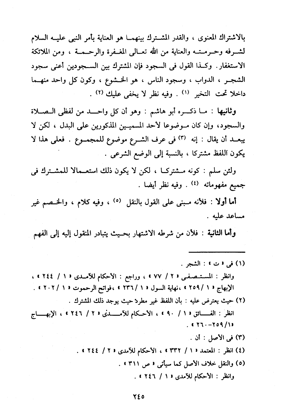 وثانيها: ما ذكره أبو هاشم: وهو أن كل واحد من لفظي الصلاة والسجود، وإن كان موضوعا لأحد المسميين المذكورين على البدل، لكن لا يبعد أن يقال: إنه في عرف الشرع موضوع للمجموع. فعلى هذا لا يكون اللفظ مشتركا، بالنسبة إلى الوضع الشرعي.