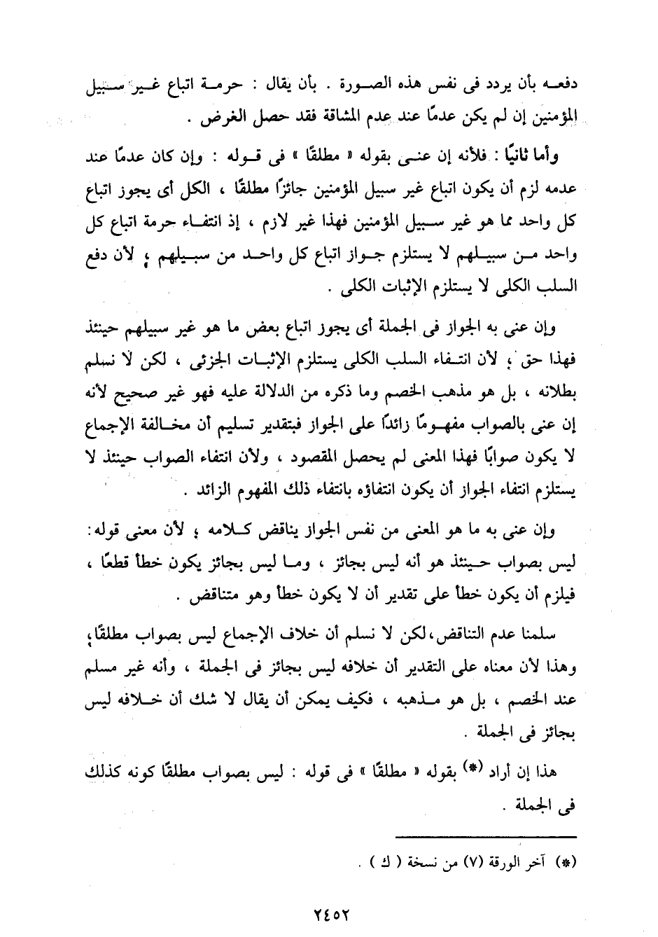 وأما ثانيًا: فلأنه إن عنى بقوله "مطلقًا" في قوله: وإن كان عدمًا عند عدمه لزم أن يكون اتباع غير سبيل المؤمنين جائزًا مطلقًا، الكل أي يجوز اتباع كل واحد مما هو غير سبيل المؤمنين فهذا غير لازم، إذ انتفاء حرمة اتباع كل واحد من سبيلهم لا يستلزم جواز اتباع كل واحد من سبيلهم؛ لأن دفع السلب الكلي لا يستلزم الإثبات الكلي.