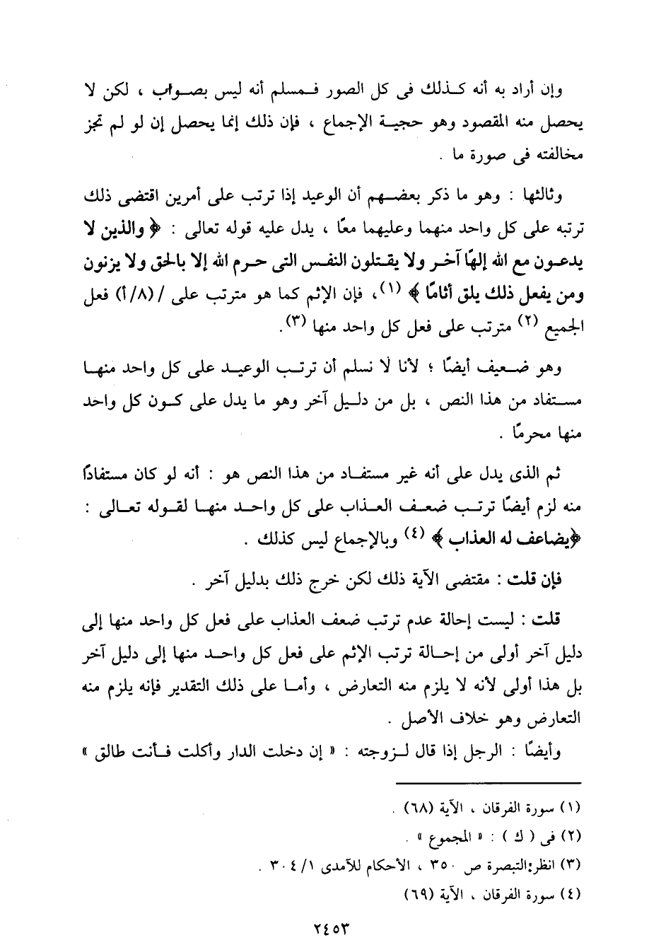 وثالثها: وهو ما ذكر بعضهم أن الوعيد إذا ترتب على أمرين اقتضى ذلك ترتبه على كل واحد منهما وعليهما معًا، يدل عليه قوله تعالى: {والذين لا يدعون مع الله إلهًا آخر ولا يقتلون النفس التي حرم الله إلا بالحق ولا يزنون ومن يفعل ذلك يلق أثامًا}، فإن الإثم كما هو مترتب على/ (8/ أ) فعل الجميع مترتب على فعل كل واحد منها.