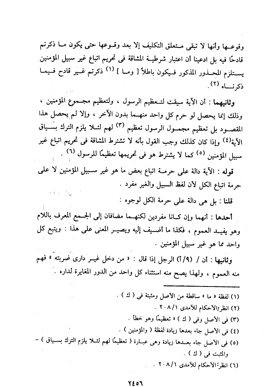 وثانيهما: أن الآية سيقت لتعظيم الرسول، ولتعظيم مجموع المؤمنين، وذلك إنما يحصل لو حرم كل واحد منهما بدون الآخر، وإلا لم يحصل هذا المقصود بل تعظيم مجمول الرسول تعظيم لهم لئلا يلزم الترك بسياق الآية وإذا كان كذلك وجب القول بأنه لا تشترط المشاقة في تحريم اتباع غير سبيل المؤمنين كما لا يشترط هو في تحريمها تعظيمًا للرسول.