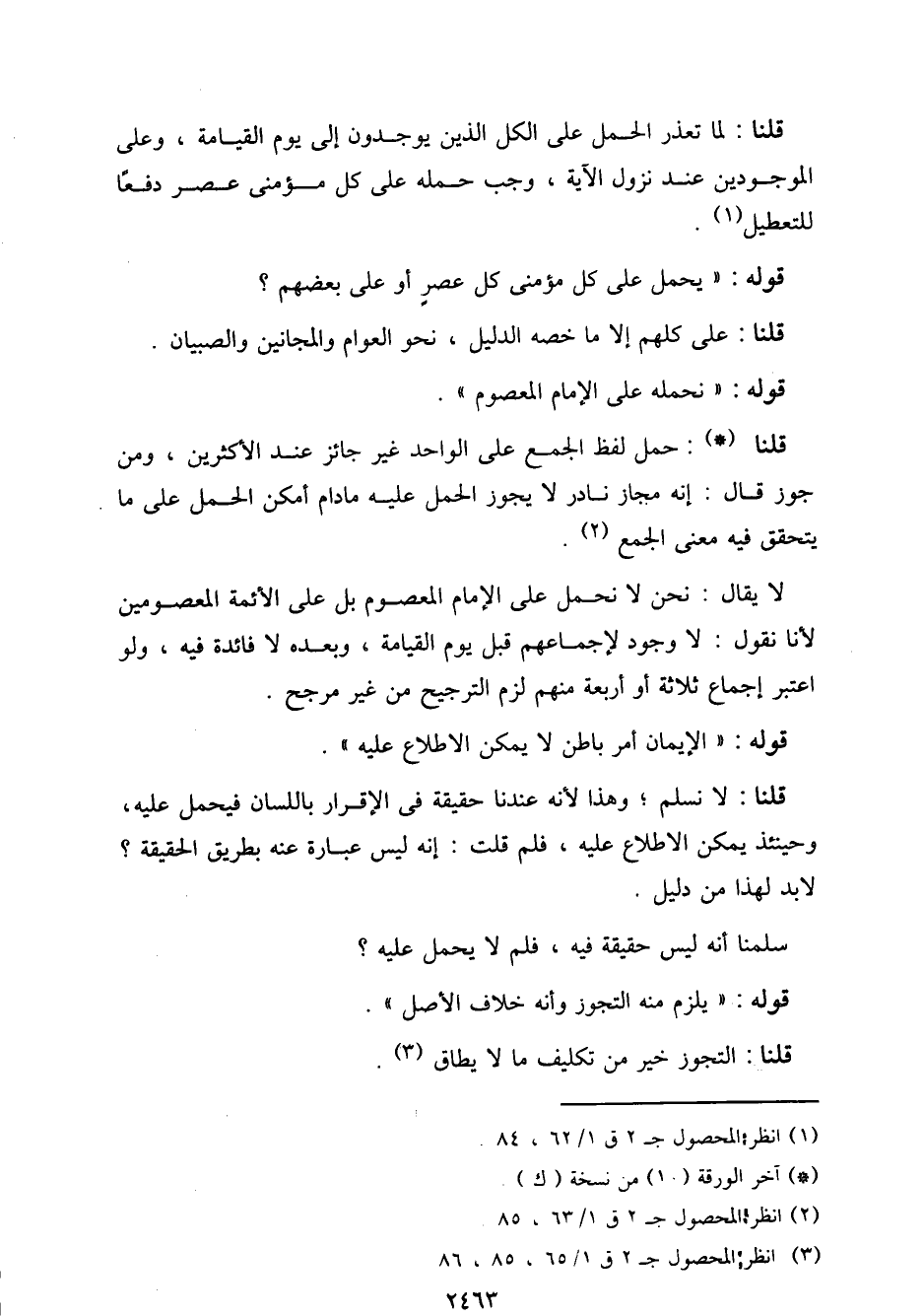 لا يقال: نحن لا نحمل على الإمام المعصوم بل على الأئمة المعصومين لأنا نقول: لا وجود لإجماعهم قبل يوم القيامة، وبعده لا فائدة فيه، ولو اعتبر إجماع ثلاثة أو أربعة منهم لزم الترجيح من غير مرجح.