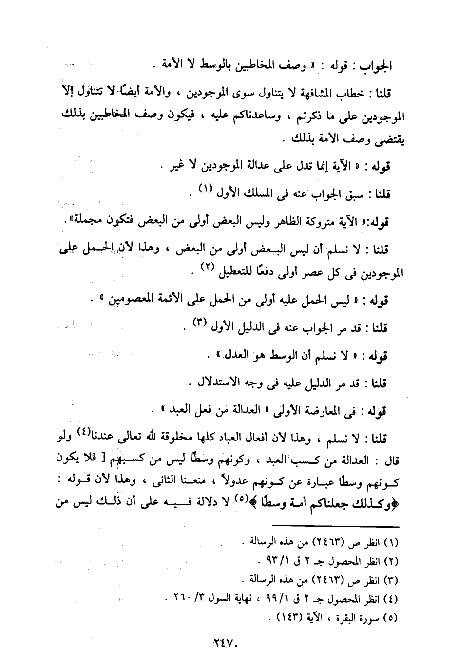 قلنا: لا نسلم، وهذا لأن أفعال العباد كلها مخلوقة لله تعالى عندنا ولو قال: العدالة من كسب العبد، وكونهم وسطًا ليس من كسبهم [فلا يكون كونهم وسطًا عبارة عن كونهم عدولاً، منعنا الثاني، وهذا لأن قوله: {وكذلك جعلناكم أمة وسطًا} لا دلالة فيه على أن ذلك ليس من